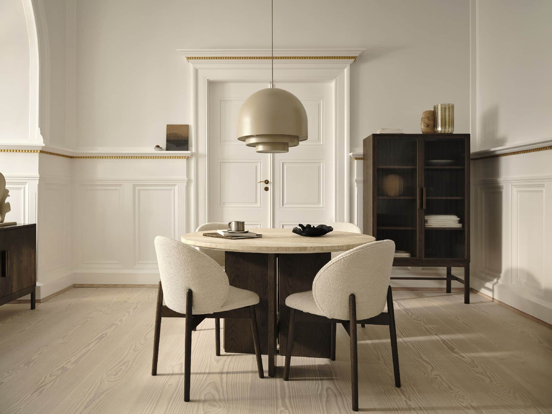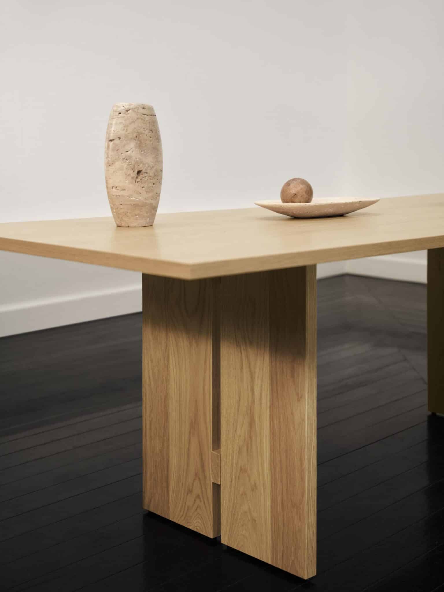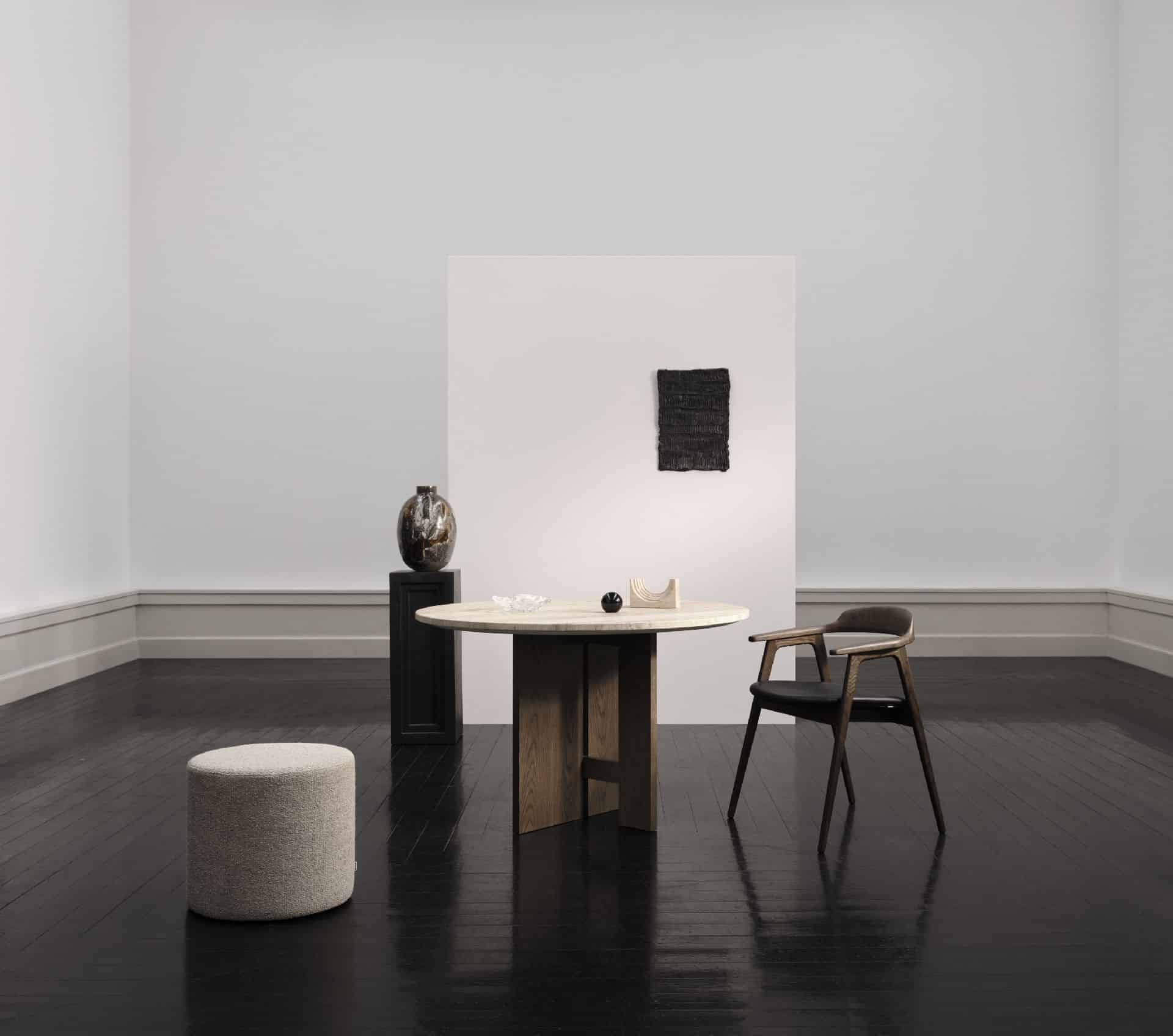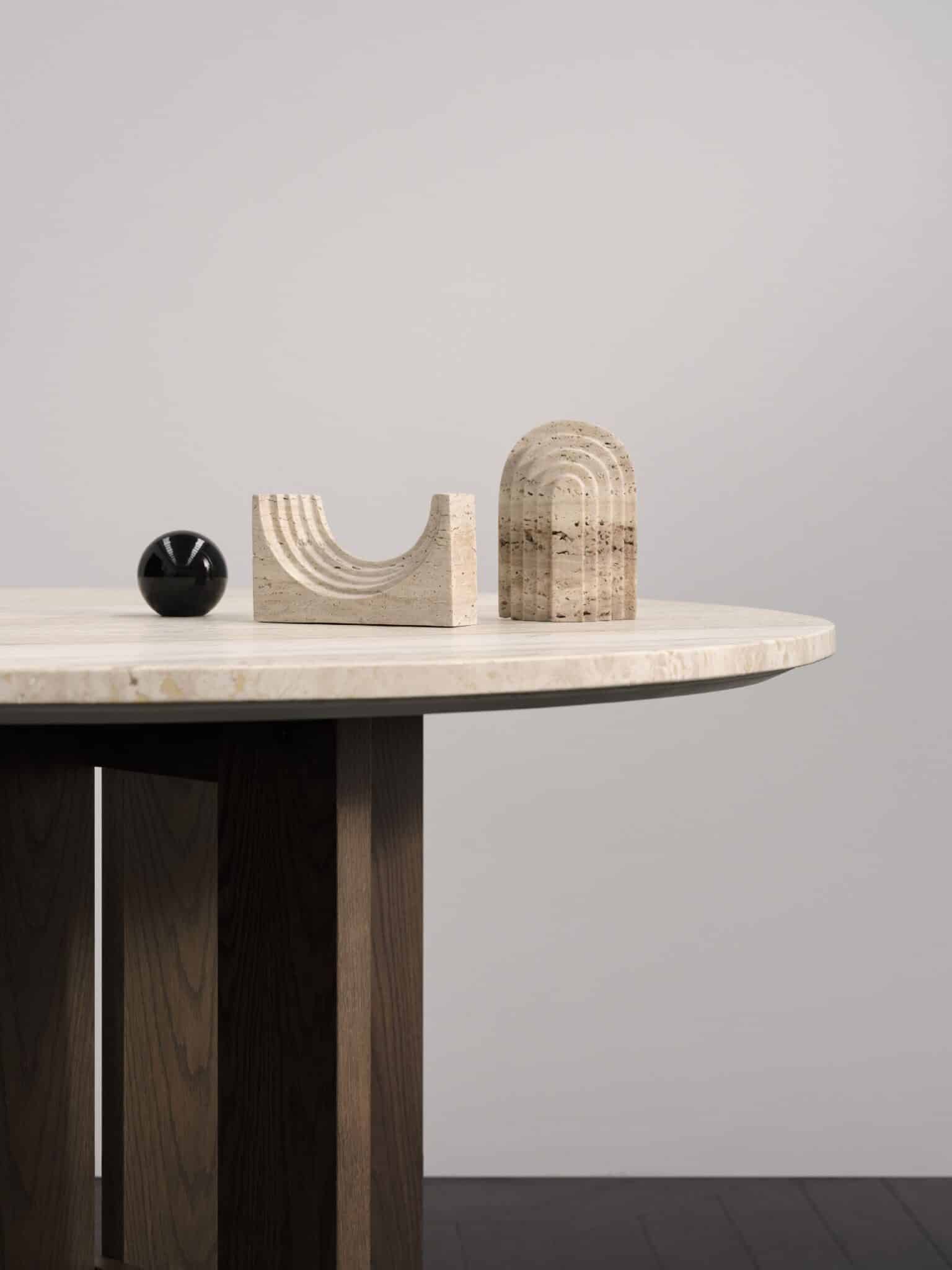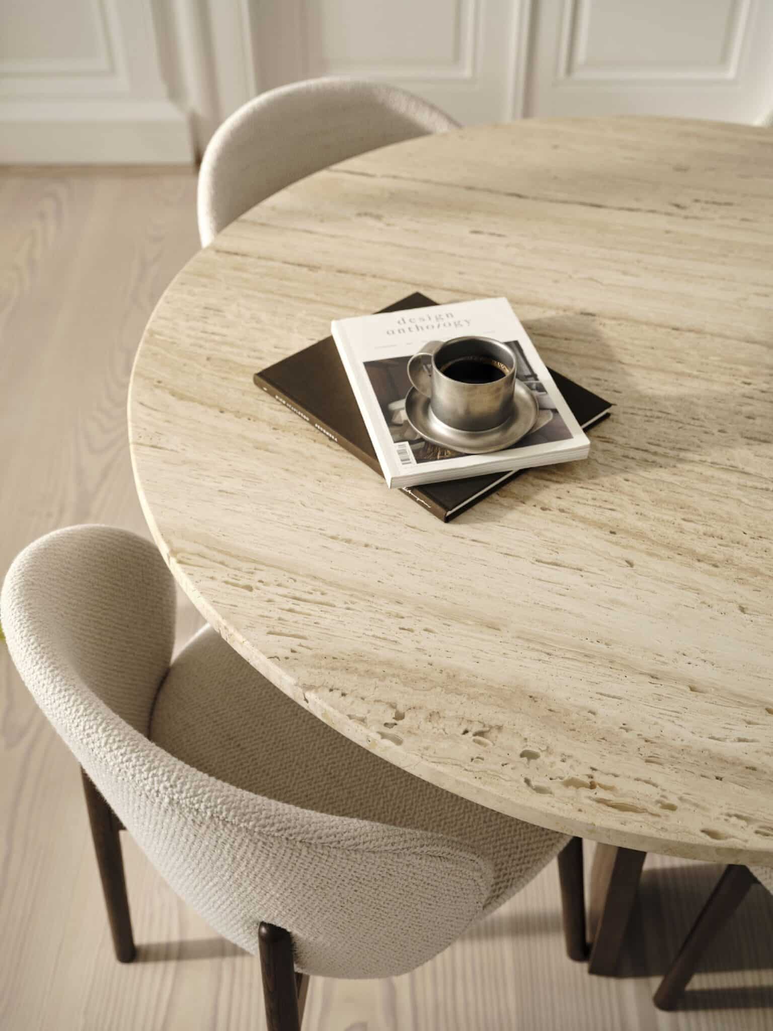 Wykonane z forniru w odcieniach naturalnego i ciemnego dębu, meble celebrują piękno prawdziwego drewna, z szerokimi liniami struktury forniru, które podkreślają głębię i fakturę. Jednym z najważniejszych elementów kolekcji jest okrągły stół jadalny z blatem z trawertynu, gdzie naturalne żłobienia i struktury sprawiają, że każdy stół jest całkowicie unikalny.