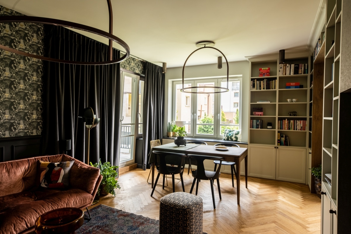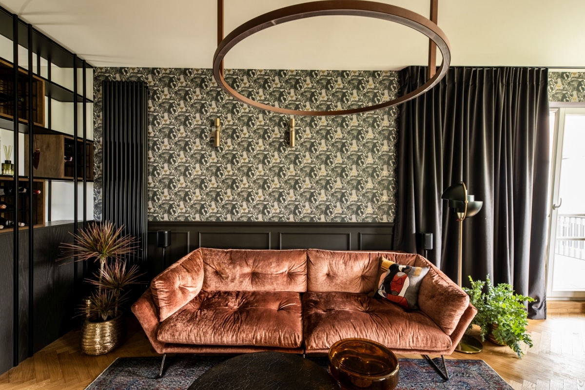 Strefa wypoczynkowa jest świadomą kompozycją kontrastów. Miękka, welurowa sofa Saba Italia w odcieniu ciepłego brązu zestawiona została z wyrazistą tapetą o bogatym wzorze oraz czarną stolarką i metalowymi akcentami. Architektki bawią się tu materiałami: ciepłe drewno sąsiaduje z chłodniejszym metalem, a organiczne kształty roślin kontrastują z geometrycznymi liniami zabudowy. Taka różnorodność nie wprowadza chaosu - przeciwnie, nadaje wnętrzu charakteru i głębi.