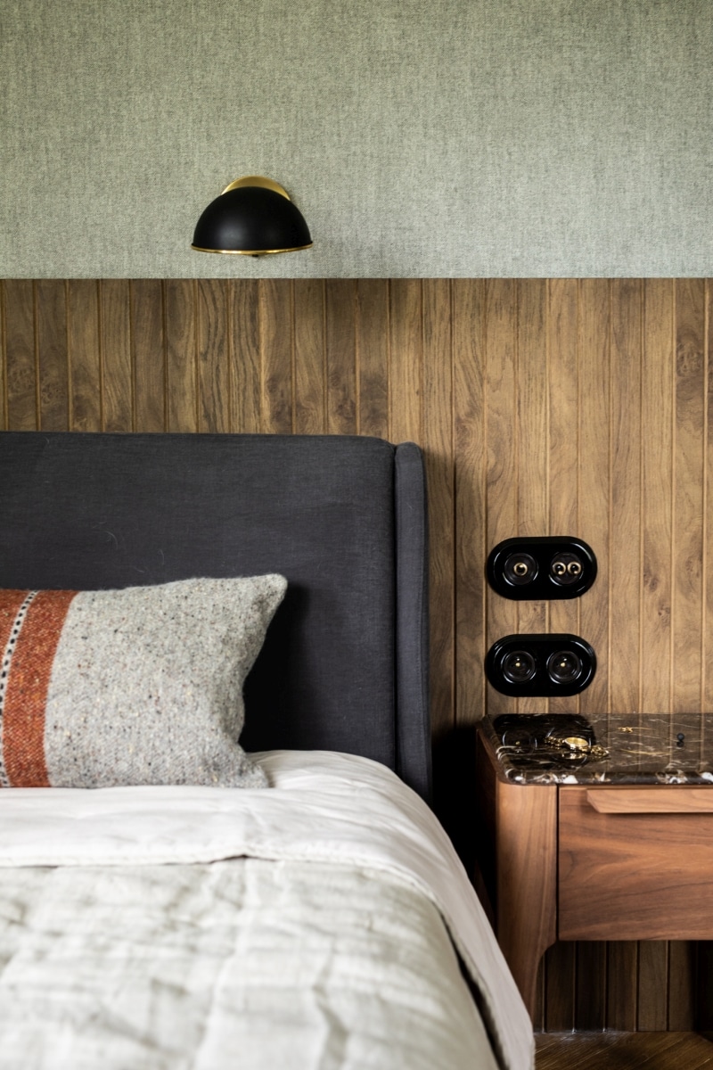 Część prywatna została zaprojektowana jako spokojne, wyciszone pomieszczenie. Ściany sypialni wykończono tkaninową tapetą o subtelnej fakturze, która ociepla przestrzeń i dodaje jej elegancji. Dolną część ścian zdobi fornirowana lamperia - detal, który wprowadza naturalność i spójność z pozostałymi pomieszczeniami. Tuż obok sypialni znajduje się niewielkie biuro, oddzielone stalowo-szklaną ścianką. Transparentna przegroda od Mag Haus pozwala zachować lekkość przestrzeni, a jednocześnie wyraźnie definiuje funkcję miejsca pracy.