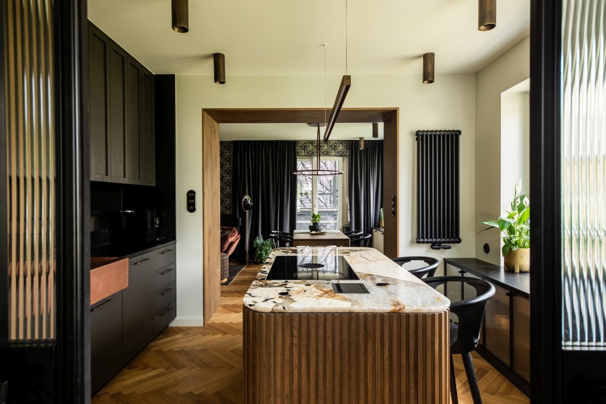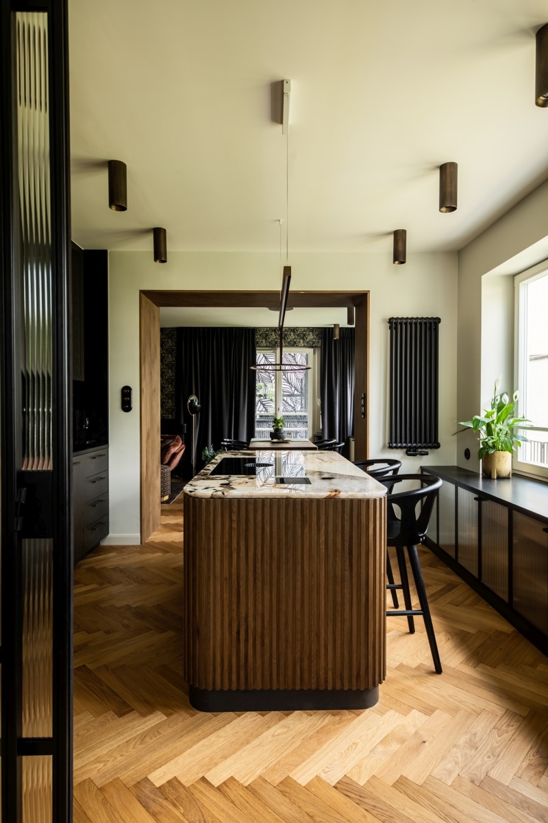 Na 80 m2 w jednej z gdyńskich dzielnic powstało wnętrze, którego charakter buduje świadoma praca z materiałem i detalem. Projekt pracowni masz.design opiera się na przemyślanej kompozycji faktur i surowców - od wyrazistej kuchennej wyspy z kamienia Patagonia, przez lekkie stalowo-szklane podziały przestrzeni, po drewniane powierzchnie o starannie dopracowanym wykończeniu. Całość zaprojektowano z myślą o codziennym życiu i spotkaniach, dlatego przestrzeń pozostaje otwarta, płynna i naturalnie sprzyja wspólnemu spędzaniu czasu.