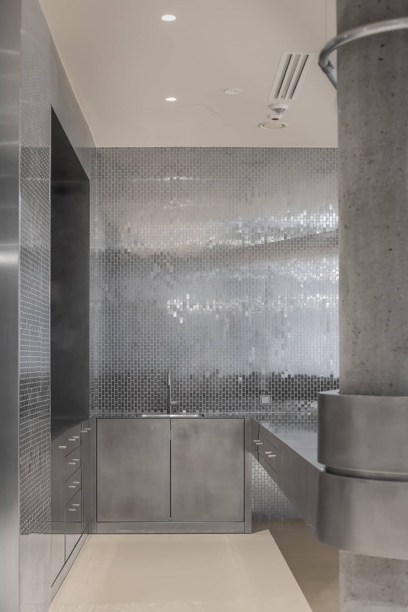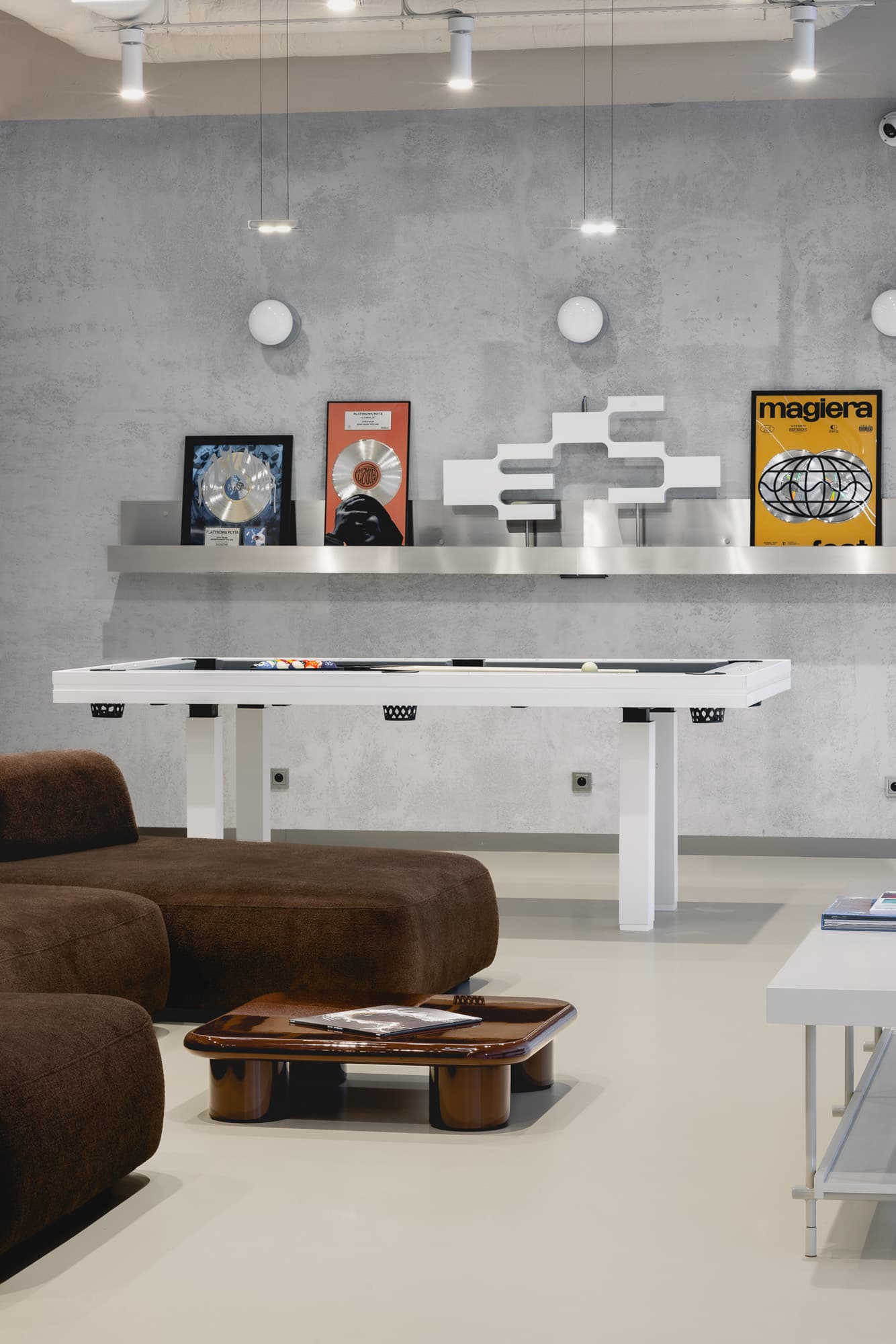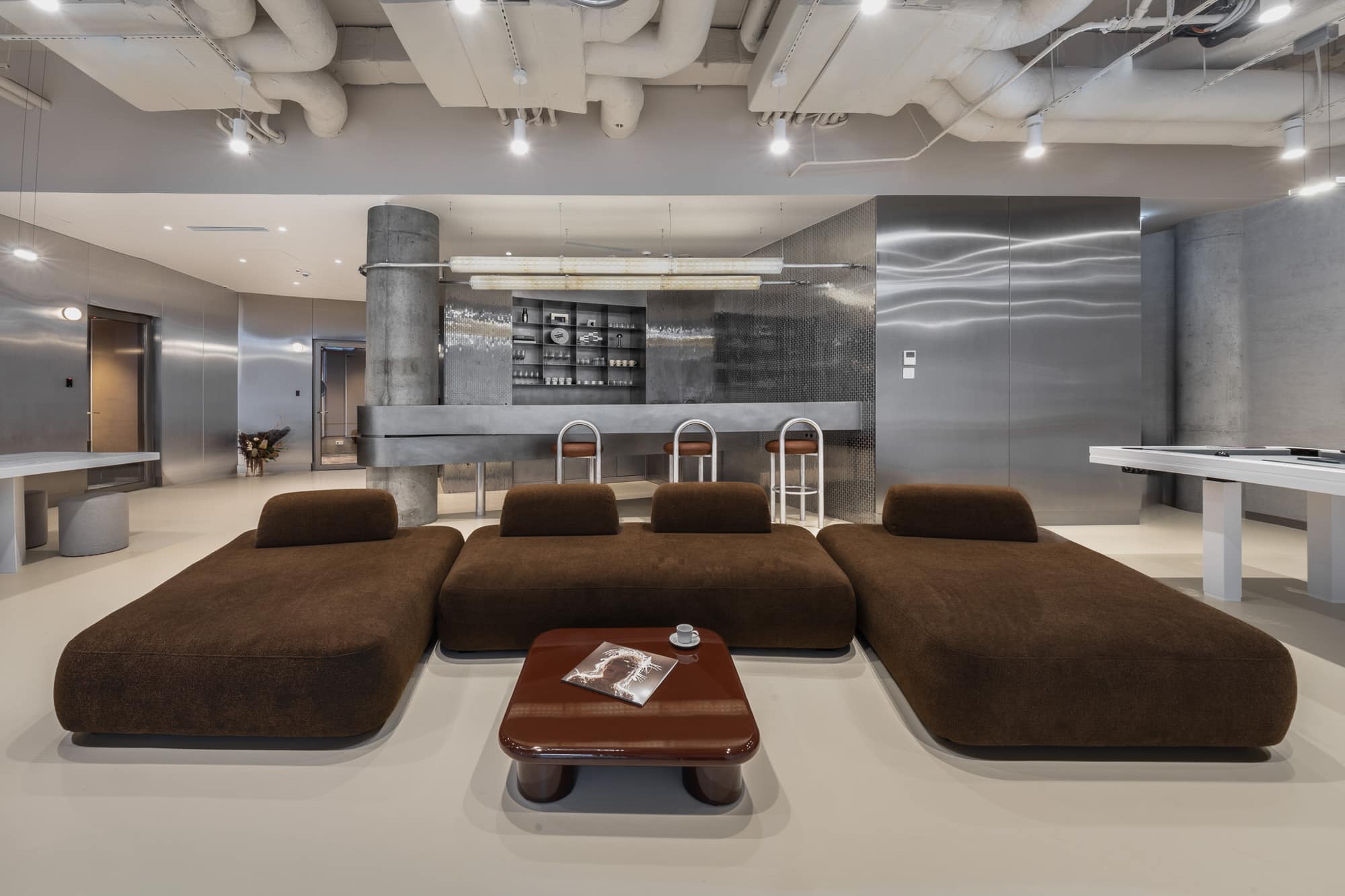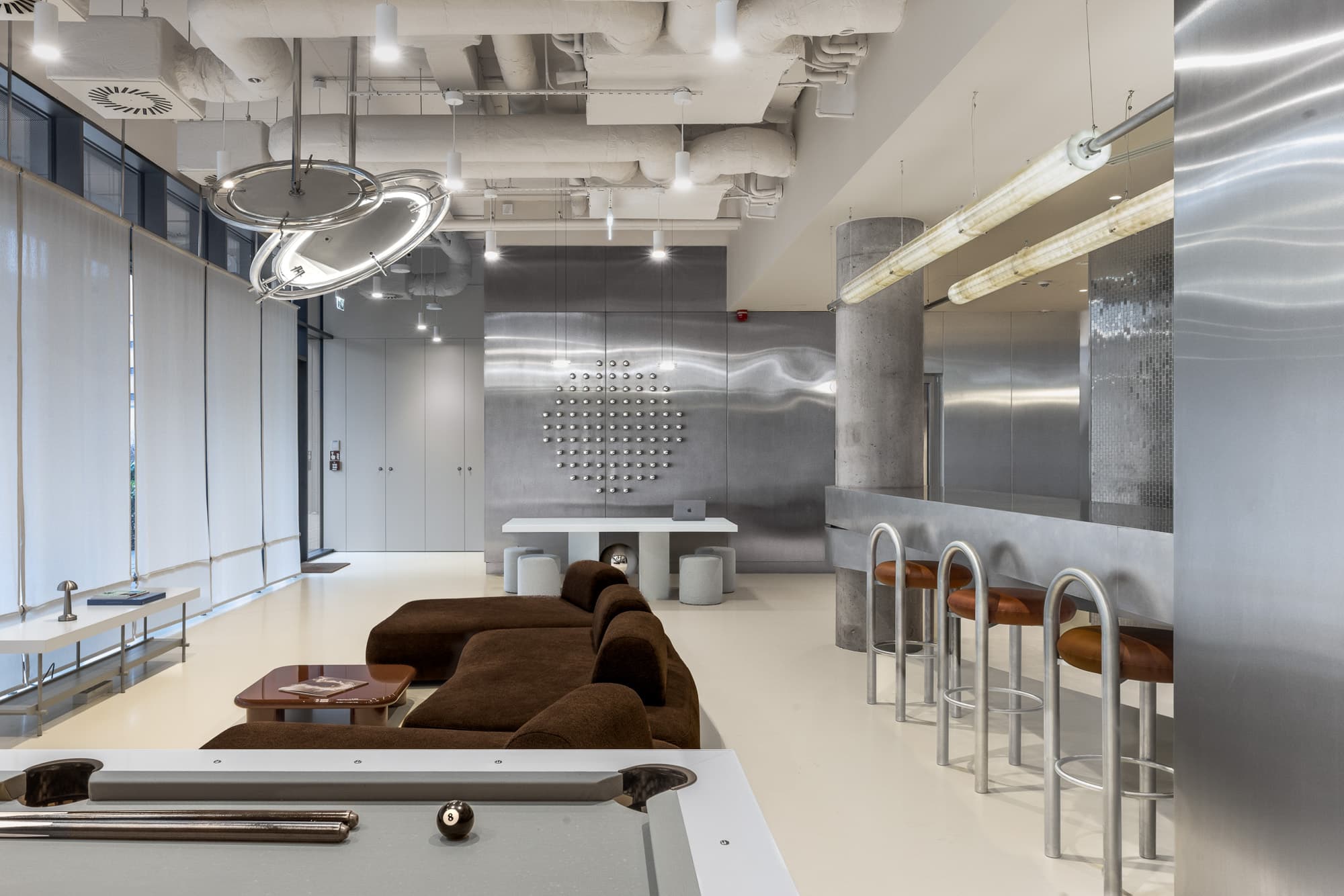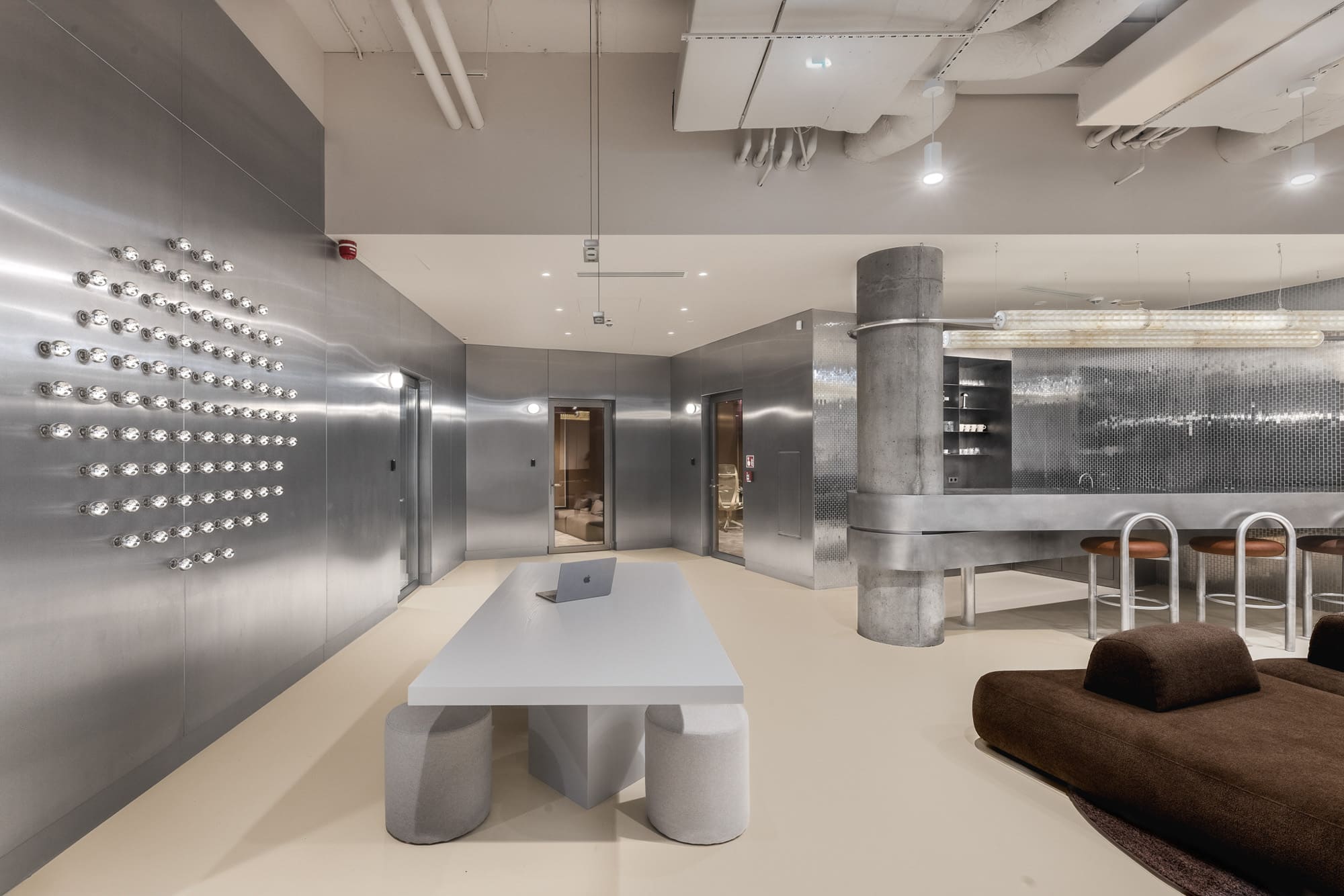 Wyraźnym kontrapunktem dla strefy nagrań jest przestrzeń spotkań, przywodząca na myśl futurystyczne wnętrza rodem z oscarowych produkcji science fiction. Dynamiczna, otwarta i pełna energii, została zaprojektowana z myślą o rozmowach, wspólnym słuchaniu muzyki oraz kameralnych wydarzeniach. Każdy element tej przestrzeni powstał na indywidualne zamówienie, specjalnie z myślą o Electric Studio. Dominującym materiałem jest stal nierdzewna, zastosowana zarówno jako okładzina ścienna, jak i w zabudowie kuchni oraz baru. Jej chłodny charakter kontrastuje z miękką sofą i stolikiem kawowym w odcieniu czekoladowego brązu.