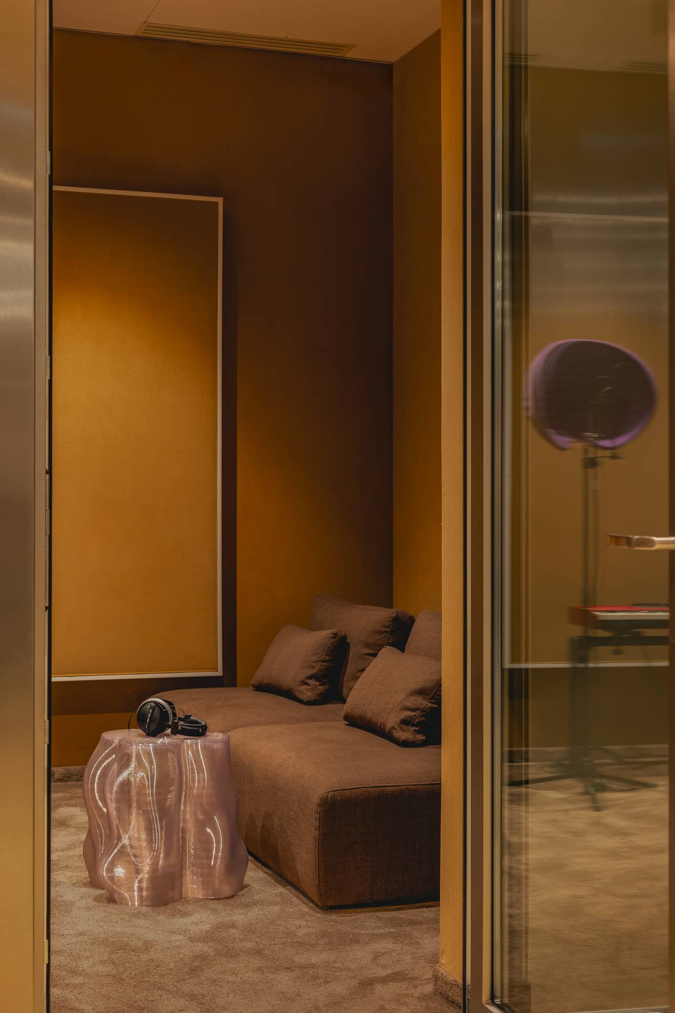 Strefa nagrań została zaprojektowana jako miejsce wyciszenia i pełnego skupienia. To harmonijne, akustycznie dopracowane wnętrza, w których artysta pracuje w formule jeden na jeden z realizatorem dźwięku. Dominuje tu stonowana, ciepła paleta barw oparta o brązy oraz ochrę, co sprzyja wyciszeniu i koncentracji. Istotną rolę odgrywa również światło, którego natężenie można indywidualnie regulować, dostosowując atmosferę do nastroju i potrzeb twórczych. To przestrzeń, która pozwala odciąć się od zewnętrznego zgiełku i skupić wyłącznie na procesie kreacji.