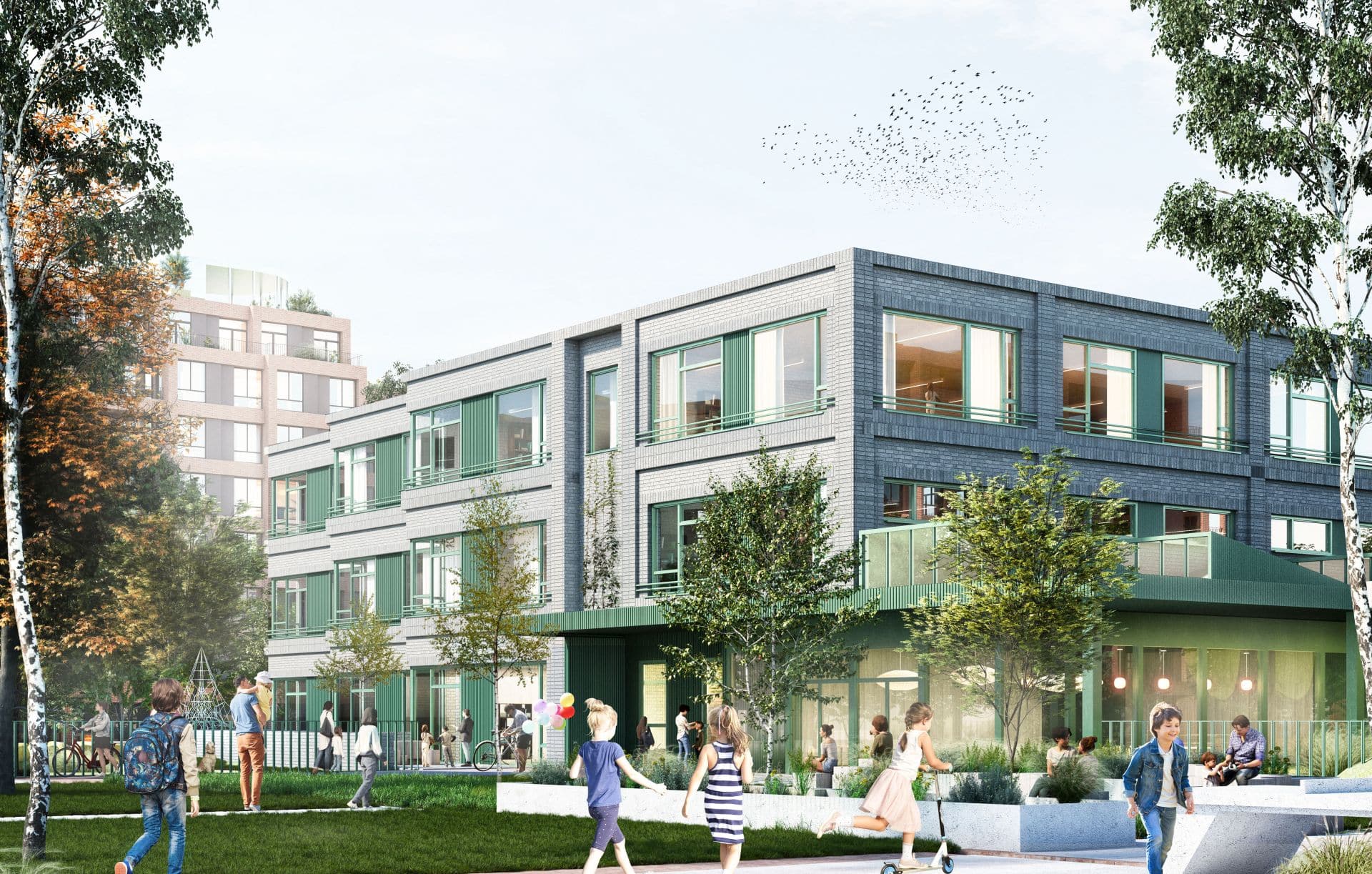 W projekcie przewidziano szkołę dla około 400 uczniów. W części realizowanej przez Spectra/Pinao znajdzie się 15 sal lekcyjnych o łącznej powierzchni użytkowej około 4700 m2, natomiast część planowana przez Skanska obejmie 9 sal lekcyjnych i około 2300 m2. Sale lekcyjne rozmieszczono tak, aby zapewnić im dwustronne doświetlenie i możliwość naturalnego przewietrzania, co przełożyło się na charakterystyczny, kaskadowy układ bryły. Budynki szkoły będą miały od dwóch do trzech kondygnacji. Jednym z ważniejszych elementów programu funkcjonalnego będzie wydzielony blok dla najmłodszych uczniów z klas 1-3, wyposażony w osobne wejście, szatnie, jadalnię oraz własne strefy zabaw na zewnątrz.
