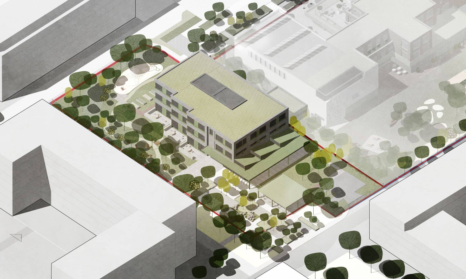 Projektowana szkoła będzie składała się z dwóch części realizowanych przez różnych inwestorów, które docelowo stworzą spójny budynek, funkcjonujący jako jedna placówka. Dla architektów z pracowni WWAA oznaczało to zaprojektowanie obiektu, który zachowa integralność funkcjonalną i przestrzenną mimo podziału inwestycji. "Ogromnym wyzwaniem było zaprojektowanie dwóch budynków realizowanych w oparciu o odrębne procedury, potencjalnie wybudowanych nie w tym samym czasie, które jednak finalnie połączą się w jeden sprawnie funkcjonujący organizm - tak, by przyszli użytkownicy nawet nie zdawali sobie sprawy z dawnej granicy podziału terenu" - podkreśla arch. Natalia Paszkowska z WWAA. Zwornikiem tej kompozycji ma być sala gimnastyczna zlokalizowana w centrum układu, stanowiąca dominantę architektoniczną budynku ze ścianą ozdobioną mozaiką.