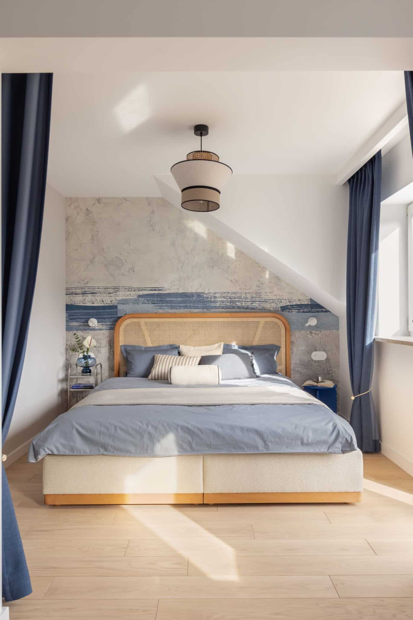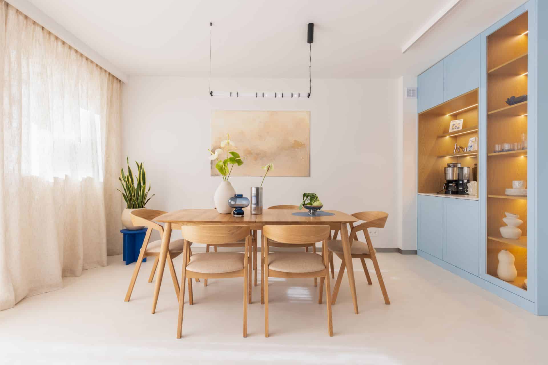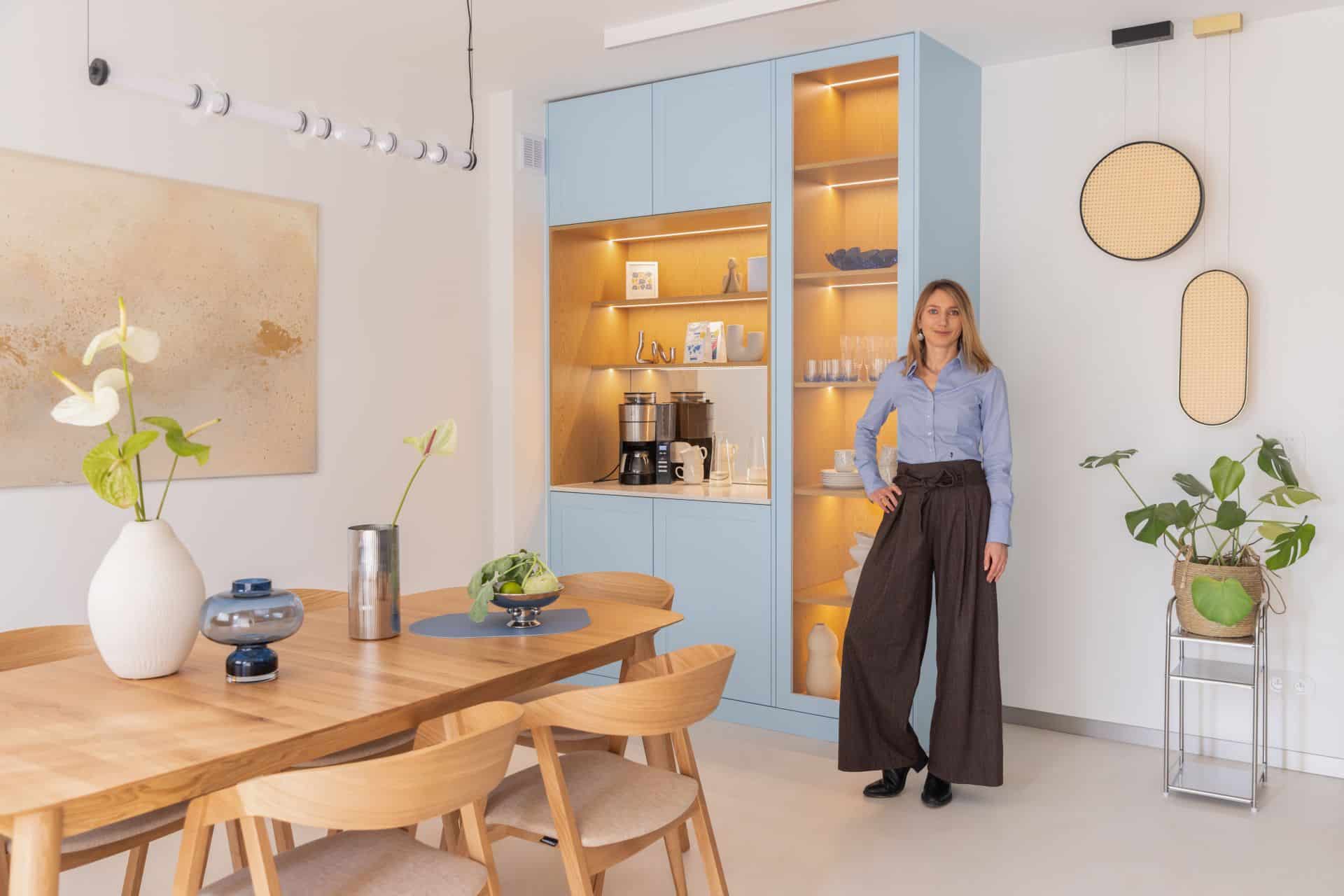 Choć baza wnętrza pozostaje stonowana - oparta na bieli, beżach i naturalnym drewnie - jego charakter definiują detale: błękitne obramowania przejść, stolarka wykonywana na zamówienie czy subtelnie podświetlony kącik kawowy, w którym fornir dębowy zestawiono z lustrzanymi powierzchniami. To właśnie w takich momentach projekt ujawnia swoją najbardziej autorską warstwę. Integralną częścią aranżacji są również dzieła sztuki. Na ścianach pojawiły się obrazy autorstwa Magdaleny Lenartowicz, które wprowadzają do wnętrza dodatkową, bardziej osobistą narrację i stanowią istotny kontrapunkt dla uporządkowanej architektury przestrzeni.