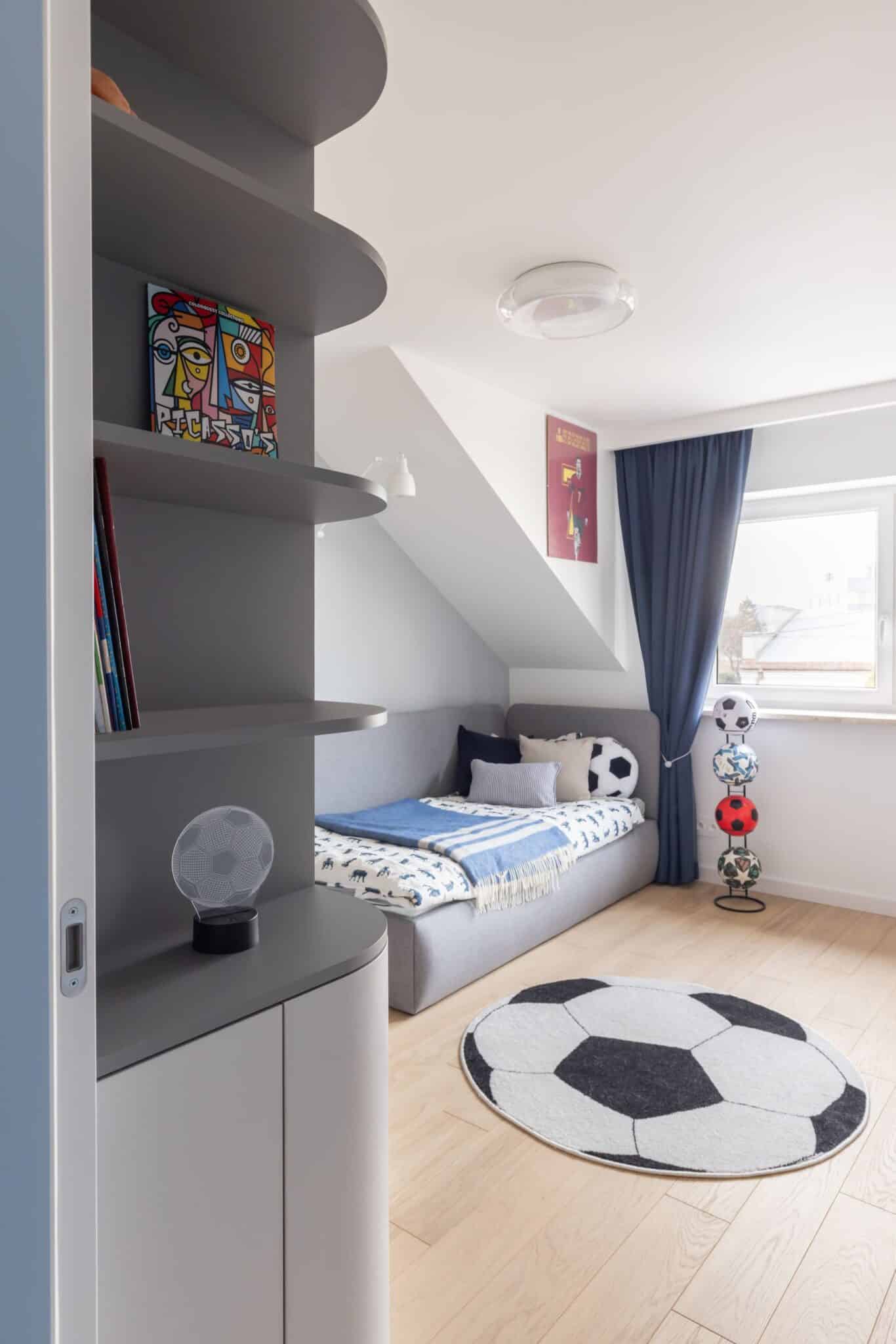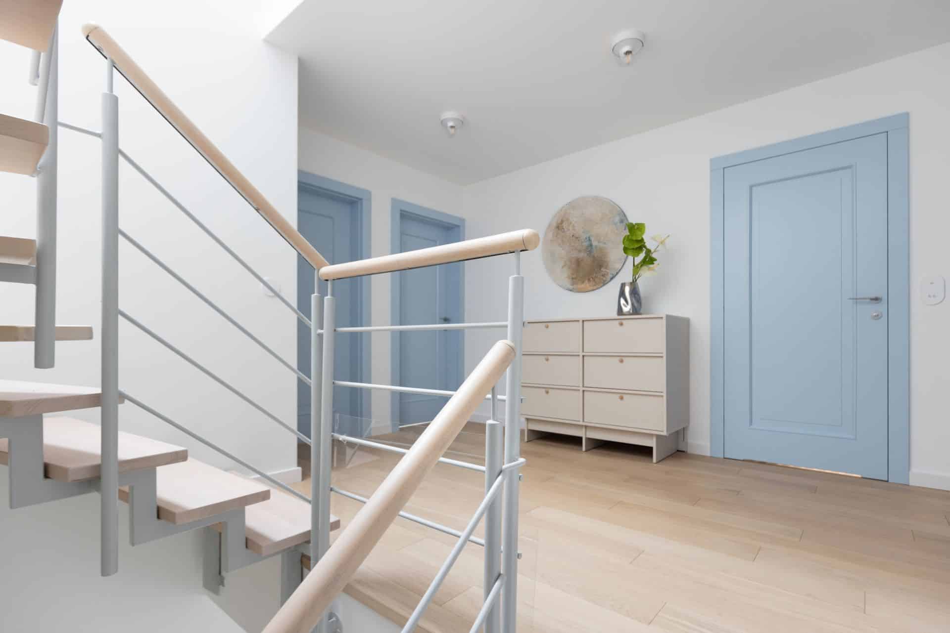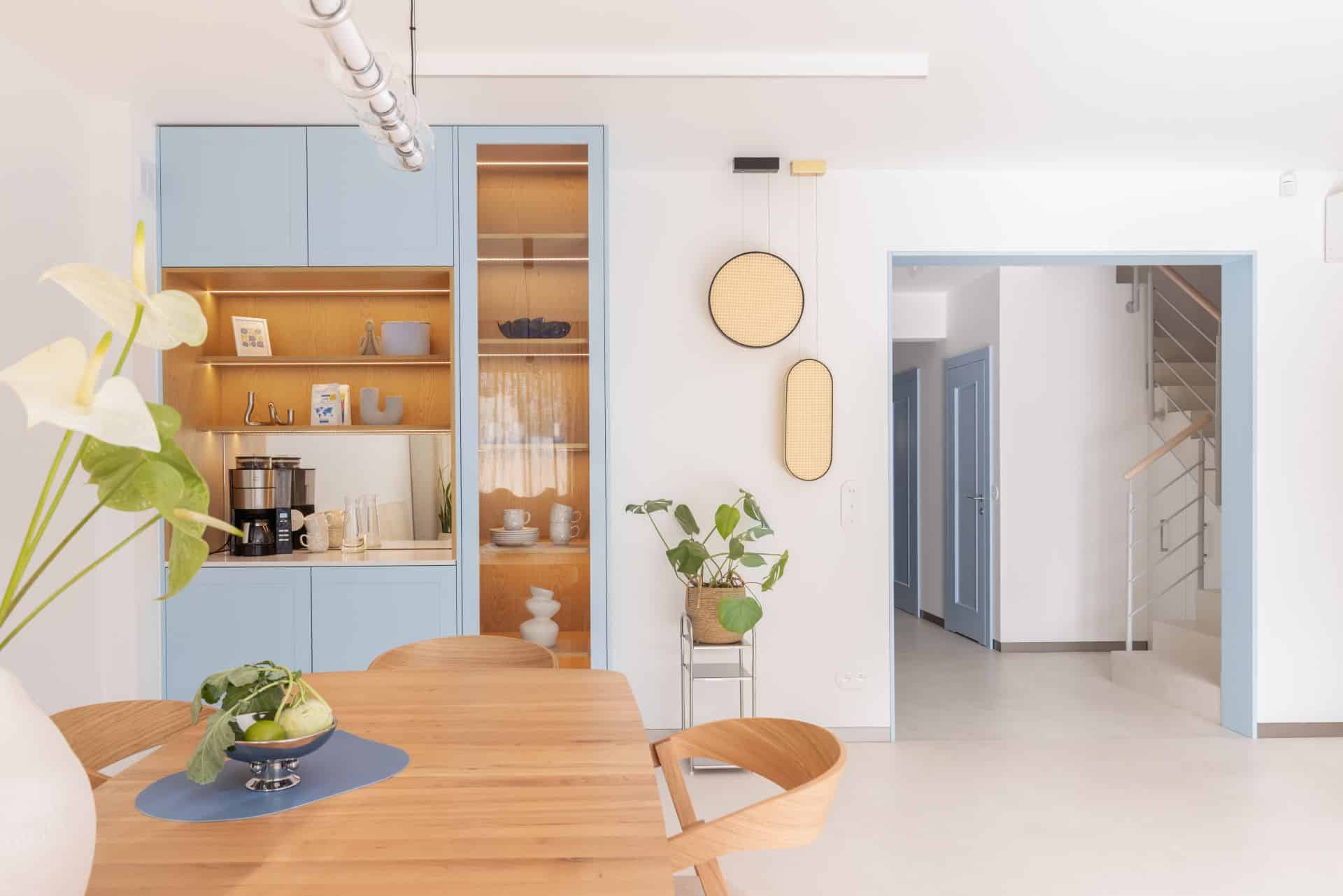 Dom o powierzchni około 220 m2, rozłożony na trzech kondygnacjach, został zaprojektowany z myślą o czteroosobowej rodzinie. Już na etapie pierwszych rozmów z inwestorami wyraźnie zarysował się kierunek. Przestrzeń miała być jasna, spójna i funkcjonalna, a jednocześnie nasycona subtelnym kolorem. Punktem wyjścia stała się osobista inspiracja: odcień błękitu, nawiązujący do koloru oczu właścicielki domu, który konsekwentnie pojawia się w zabudowach stolarskich, drzwiach oraz detalach wykończeniowych.