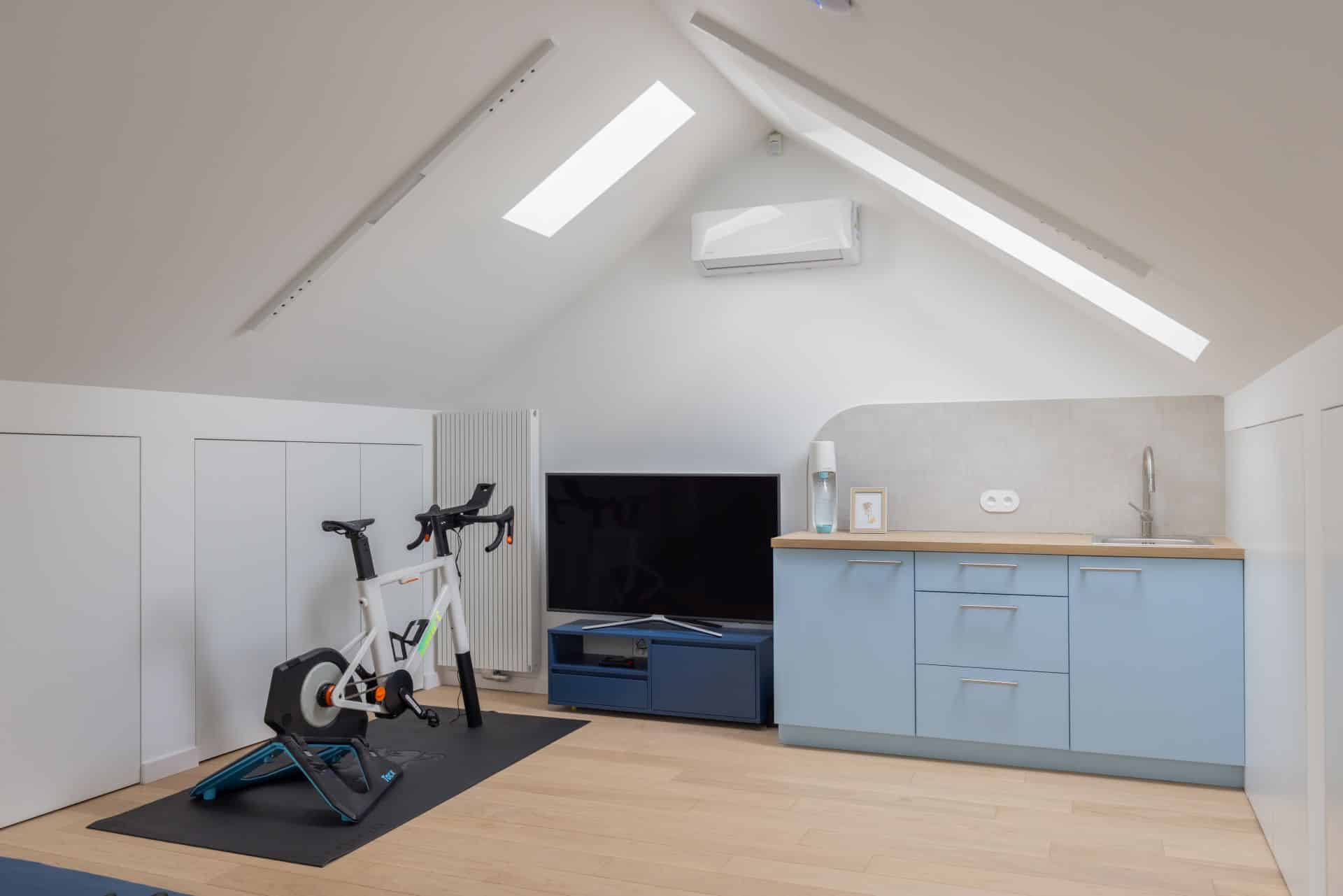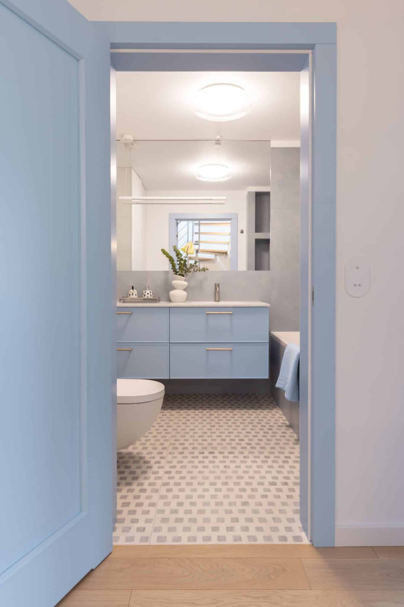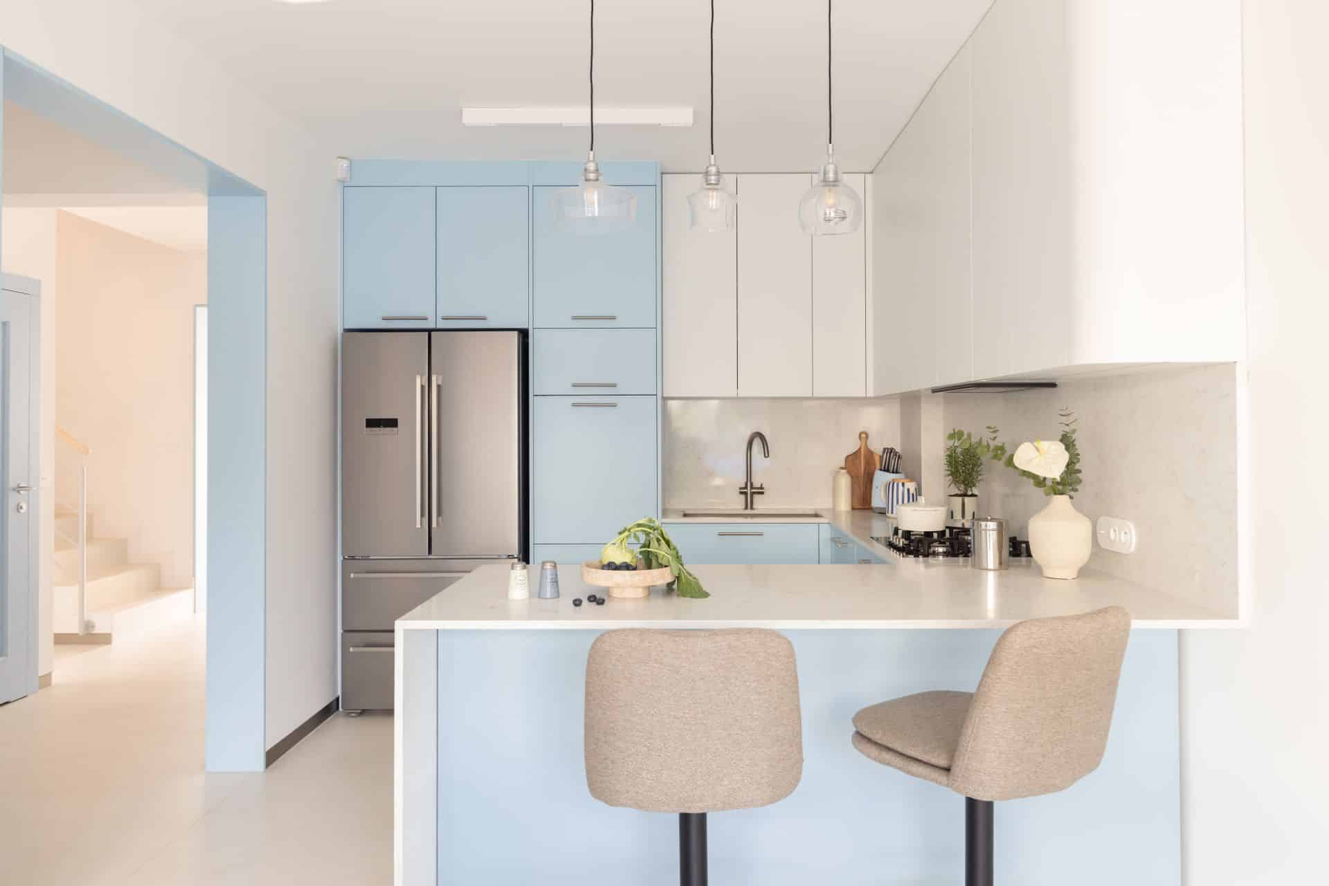 Dom o powierzchni około 220 m2, rozłożony na trzech kondygnacjach, został zaprojektowany z myślą o czteroosobowej rodzinie. Już na etapie pierwszych rozmów z inwestorami wyraźnie zarysował się kierunek. Przestrzeń miała być jasna, spójna i funkcjonalna, a jednocześnie nasycona subtelnym kolorem. Punktem wyjścia stała się osobista inspiracja: odcień błękitu, nawiązujący do koloru oczu właścicielki domu, który konsekwentnie pojawia się w zabudowach stolarskich, drzwiach oraz detalach wykończeniowych.