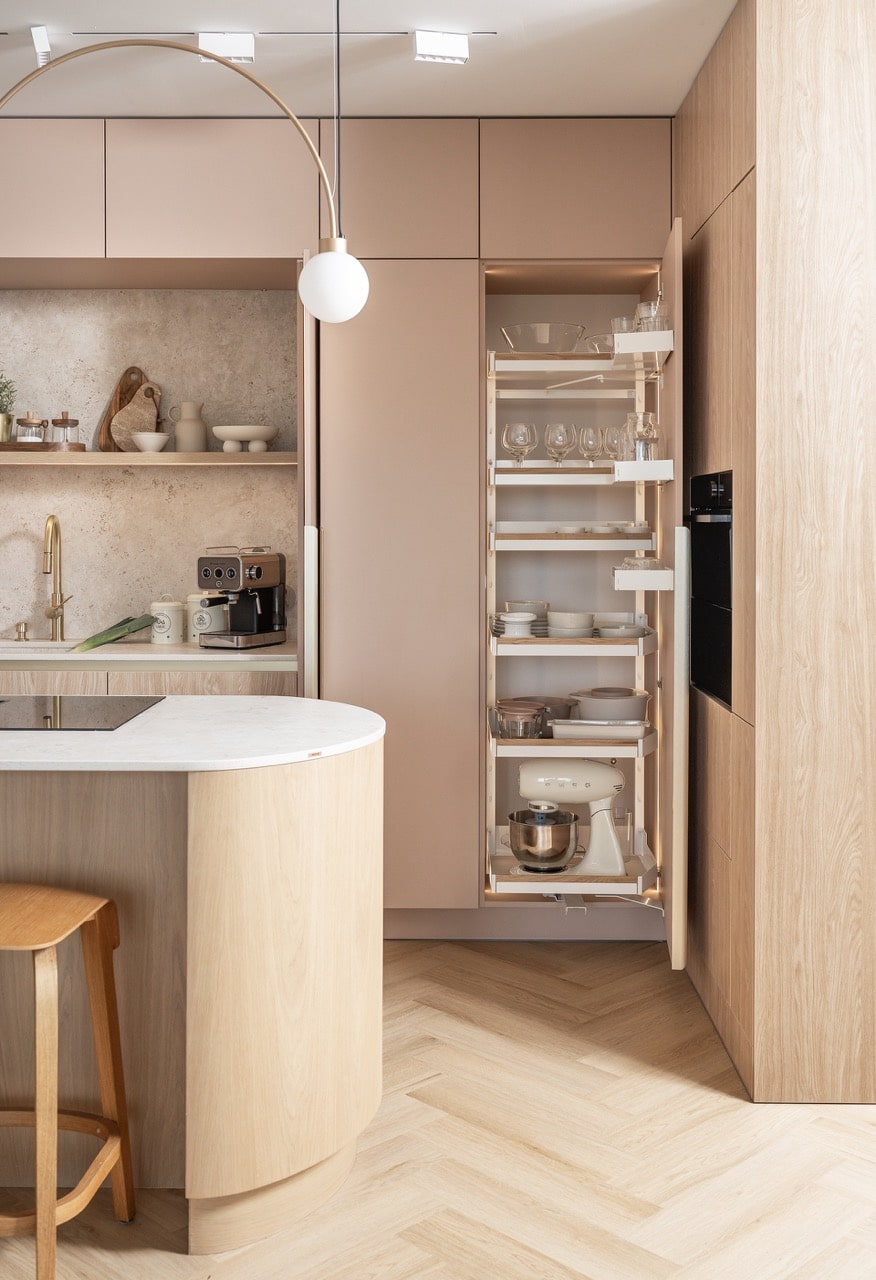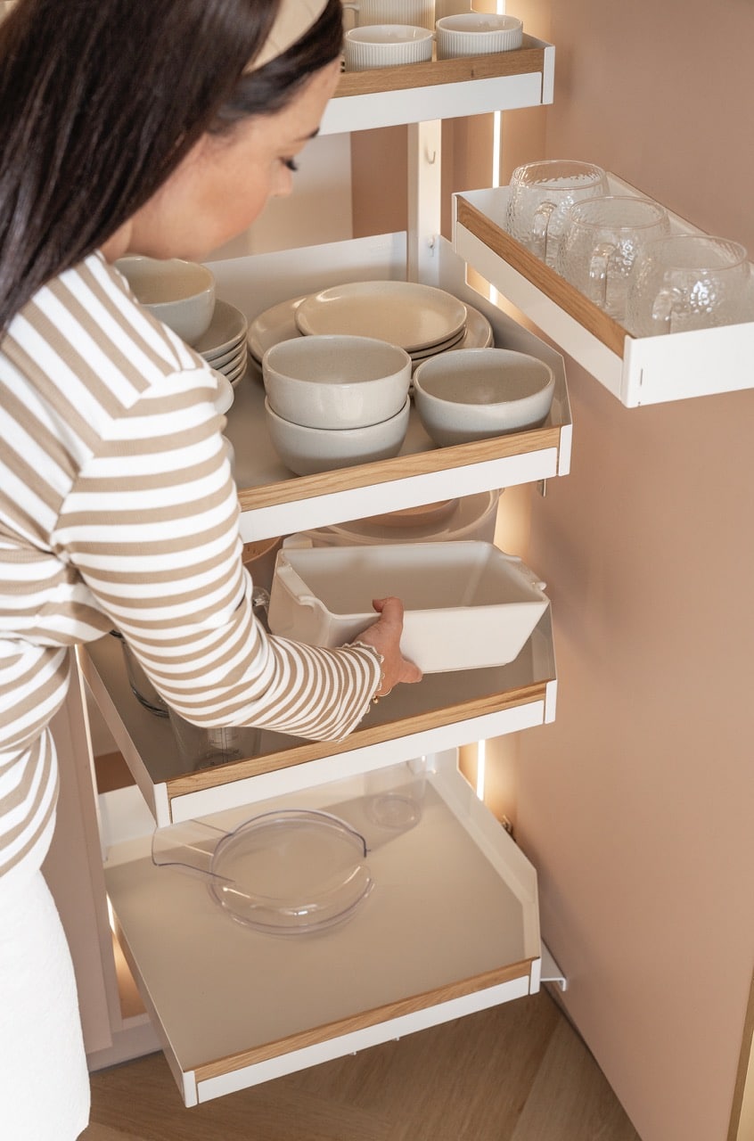 Kiedy wszystkie składniki są już przygotowane, pora sięgnąć po sprzęty, które czekają tuż obok - równie uporządkowane i równie łatwo dostępne. Po drugiej stronie kuchennej zabudowy, sprytnie ukryte w systemie PLENO MAXI PLUS, czekają kuchenni pomocnicy. Jedno pełne wysunięcie i robot kuchenny, miski oraz formy do pieczenia stają się częścią poranka. Nie ma szukania, grzebania, przekładania. Jest tylko przyjemność.