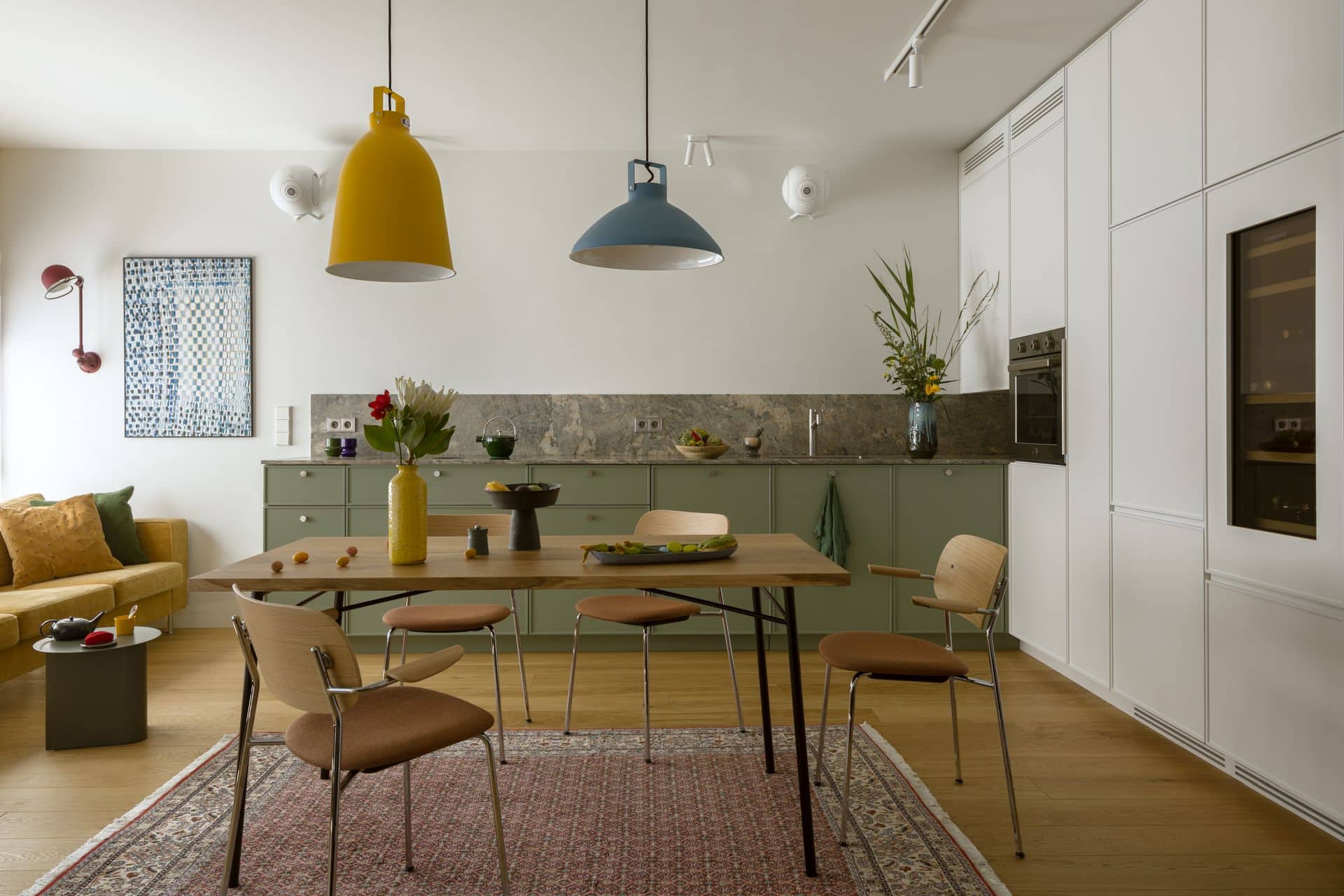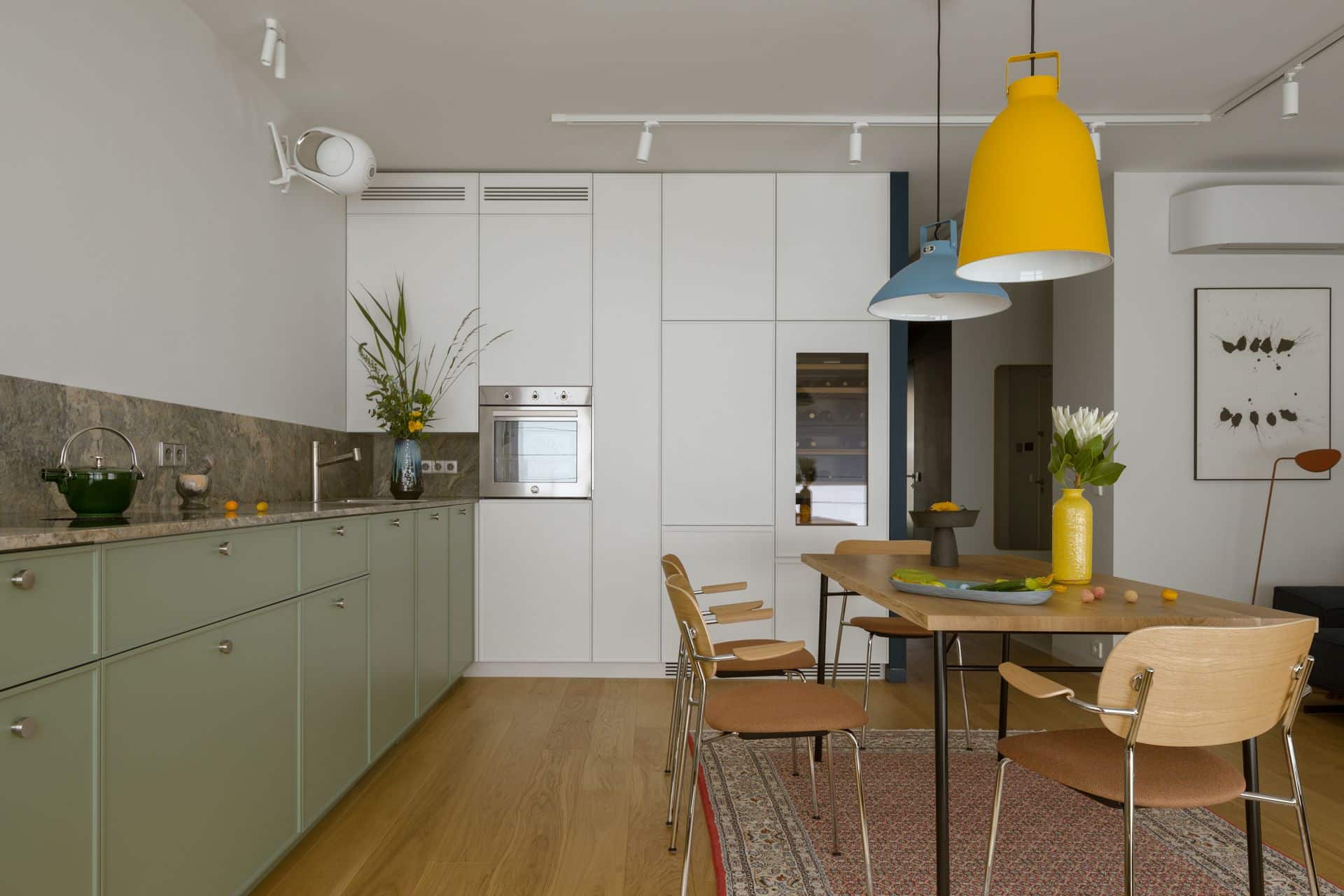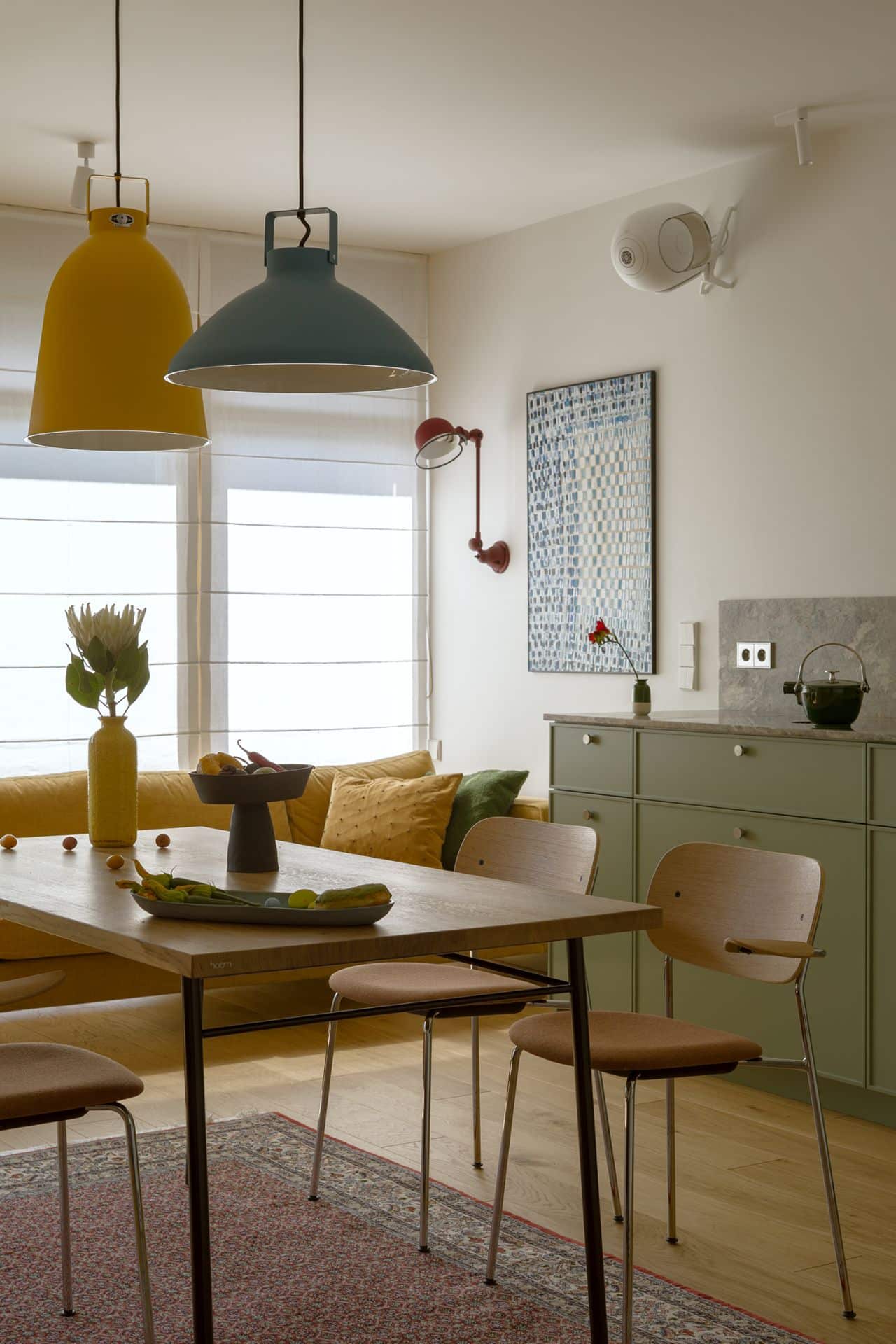 Kolorystyka wnętrza opiera się na grze kontrastów: granaty, błękity, żółcie, zielenie i czerwienie tworzą w efekcie rytmiczną, przykuwającą wzrok kompozycję. Materiały dobrano z myślą o autentyczności. Naturalny kamień, zielone fronty kuchenne, lniane kotary w odważnych kolorach, matowe powierzchnie, czy ręcznie formowane lampy Jieldé, budują narrację opartą na dotyku i świetle - pełną niuansów i zmysłowych kontrastów. Wnętrze dopełniają abstrakcyjne obrazy Łukasza Blikle, które wprowadzają do wnętrza ruch i emocje.