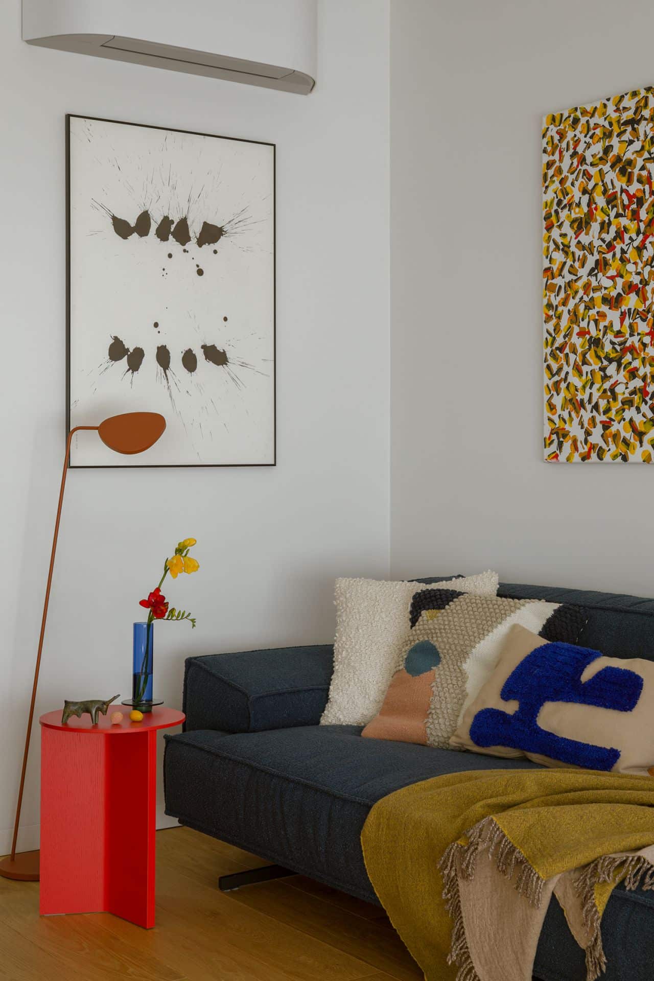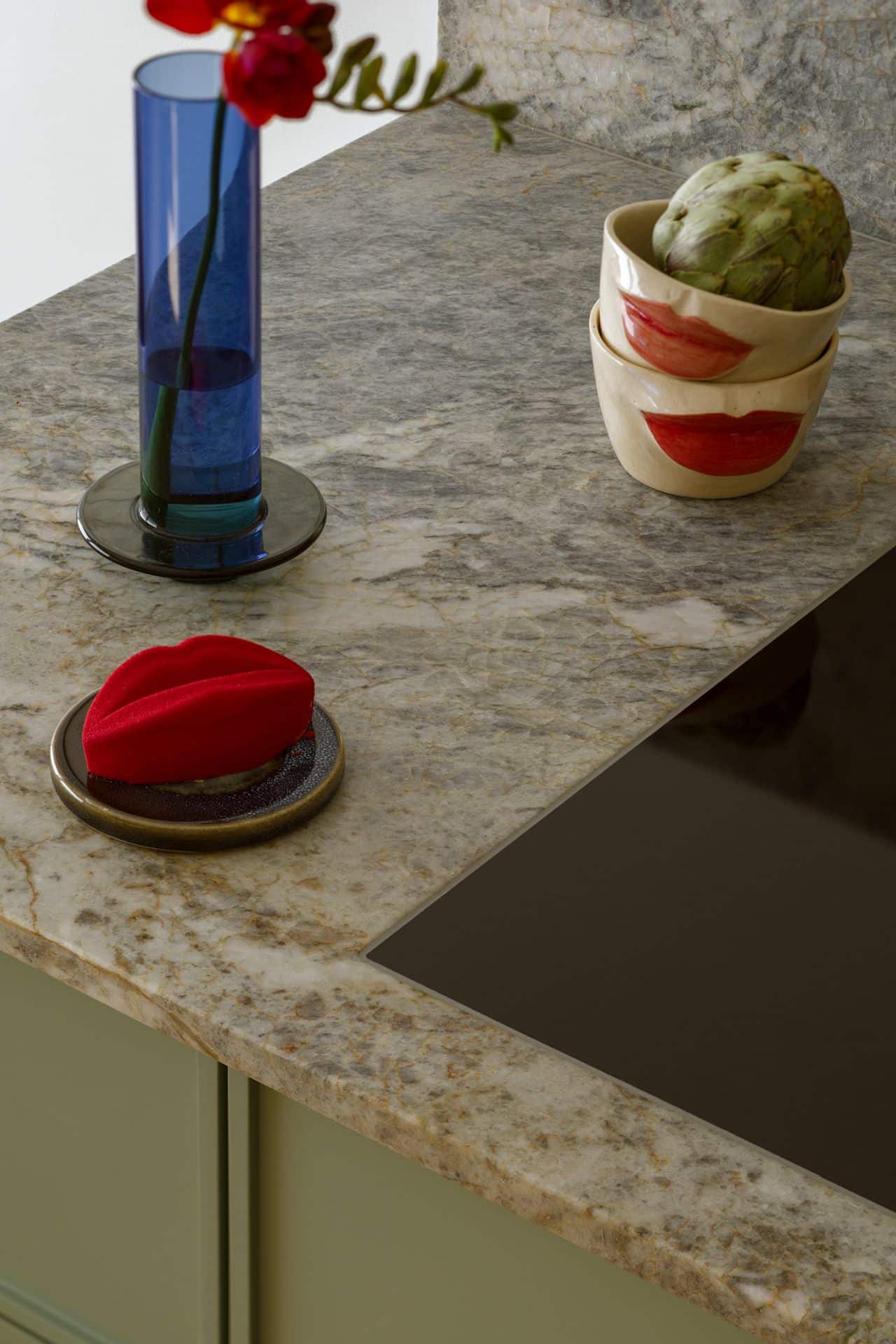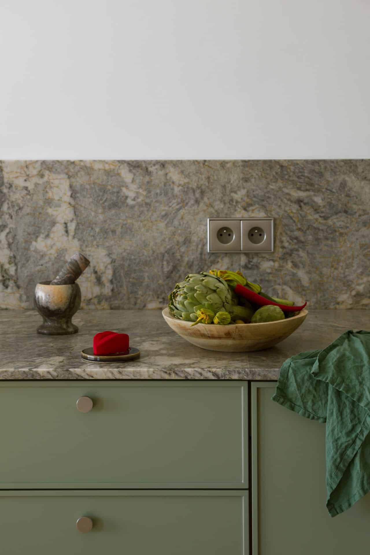 Kolorystyka wnętrza opiera się na grze kontrastów: granaty, błękity, żółcie, zielenie i czerwienie tworzą w efekcie rytmiczną, przykuwającą wzrok kompozycję. Materiały dobrano z myślą o autentyczności. Naturalny kamień, zielone fronty kuchenne, lniane kotary w odważnych kolorach, matowe powierzchnie, czy ręcznie formowane lampy Jieldé, budują narrację opartą na dotyku i świetle - pełną niuansów i zmysłowych kontrastów. Wnętrze dopełniają abstrakcyjne obrazy Łukasza Blikle, które wprowadzają do wnętrza ruch i emocje.
