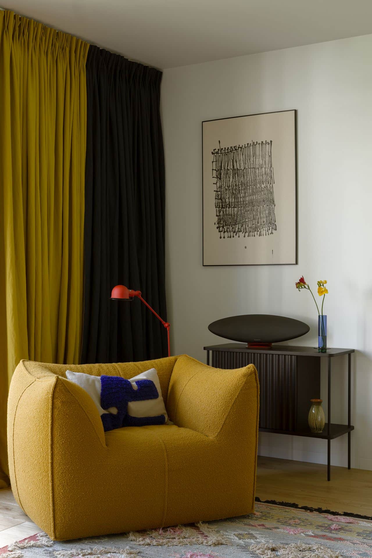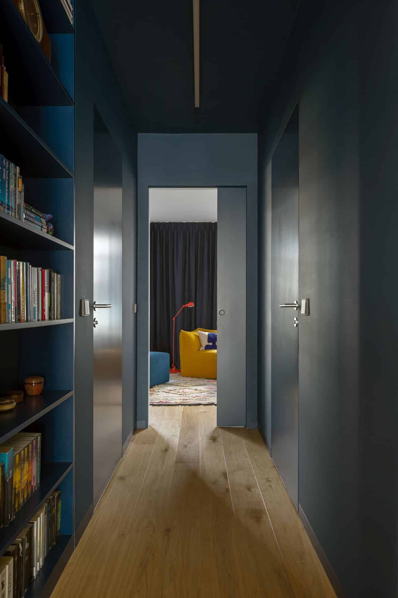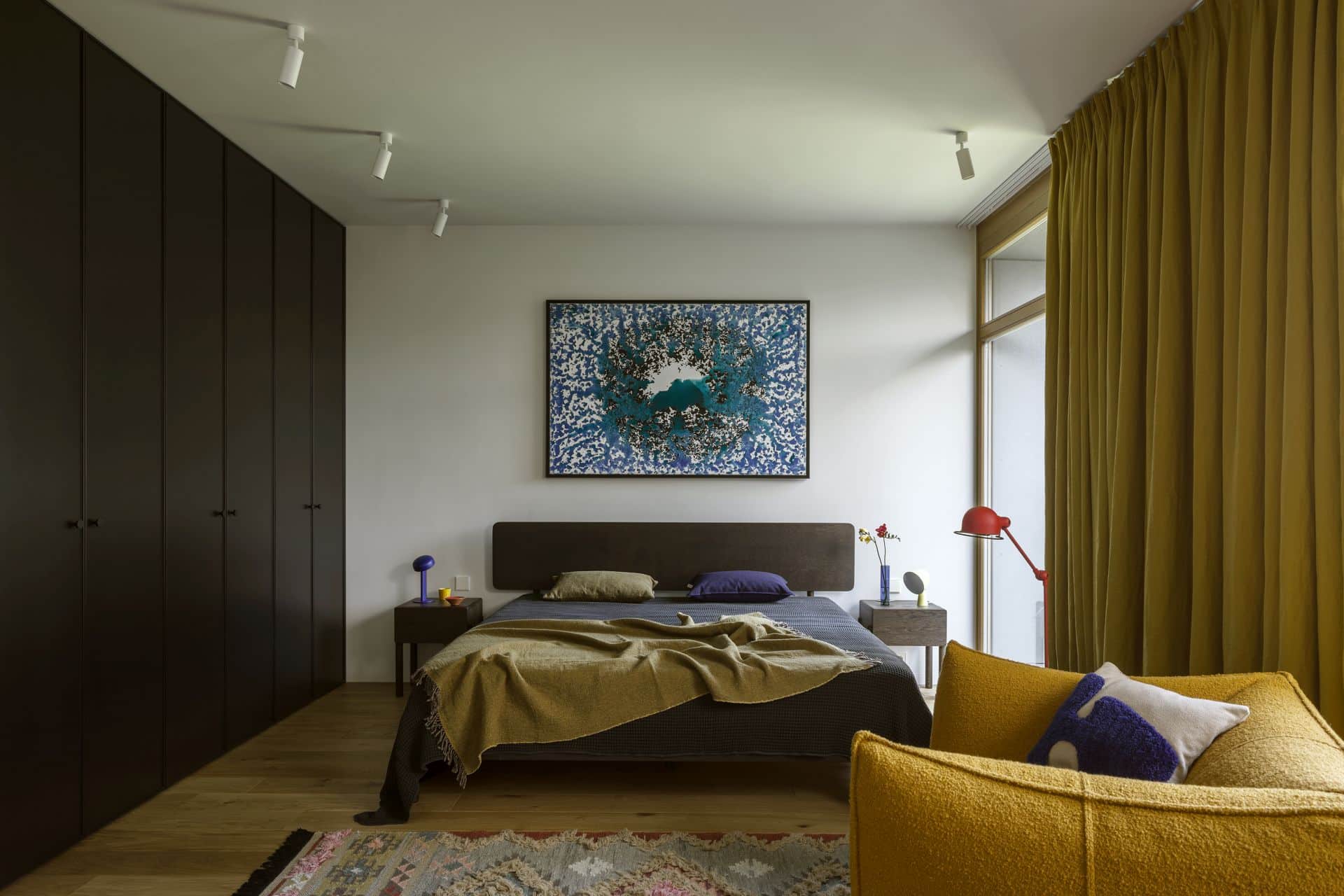 Korytarz łączący strefę salonu z sypialnią utrzymano w głębokim odcieniu granatu, kolorze, który objął także sufit, tworząc nastrojową, niemal filmową strefę prowadzącą do kolejnego pomieszczenia. Mocny, ciemny akcent otwiera się na graficzną sypialnię pełną kontrastów, barwnych detali i teatralnych zasłon. Wydzielono w niej strefę relaksu, czyli miejsce do czytania i słuchania muzyki. Centralnym punktem jest tu ikoniczny fotel Le Bambole od B&B Italia.