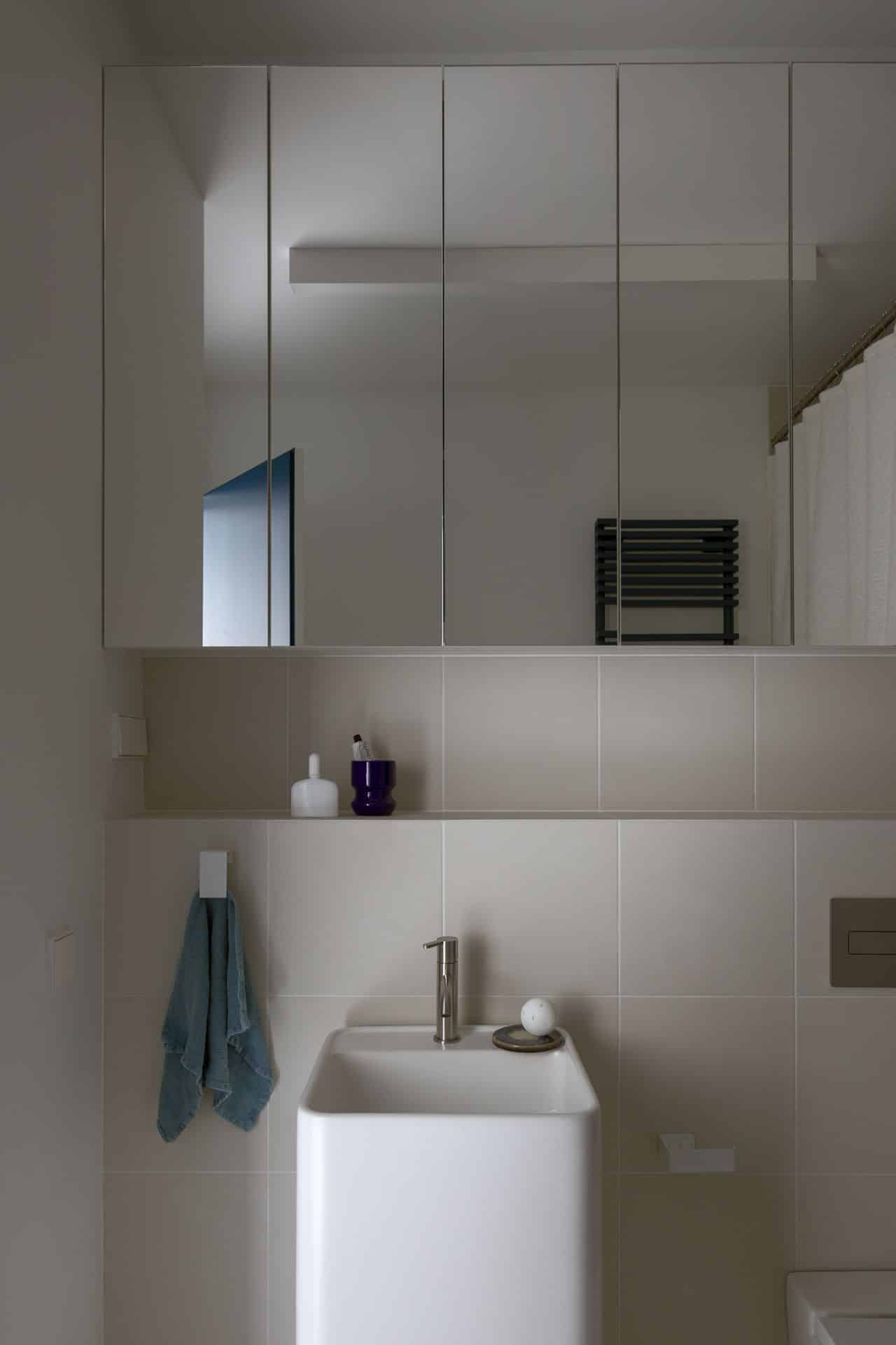 Łazienka gra z kolei fakturami i strukturą. Płytki Mutina w trzech odcieniach, o zróżnicowanym odbiciu światła zestawiono z lnianą zasłoną szytą na miarę. Ten nieoczywisty, pop-artowy gest nadaje wnętrzu miękkości i charakteru, przełamując typowy chłód minimalistycznych aranżacji. Całość uzupełniają osobna garderoba i pralnia, ukryte w zabudowach stolarskich wykonanych przez SSF Meble.