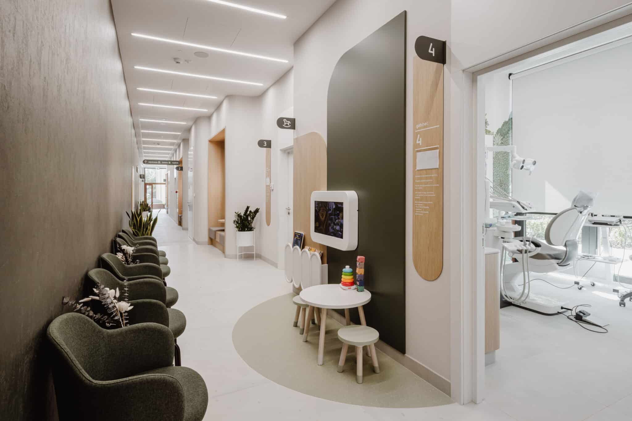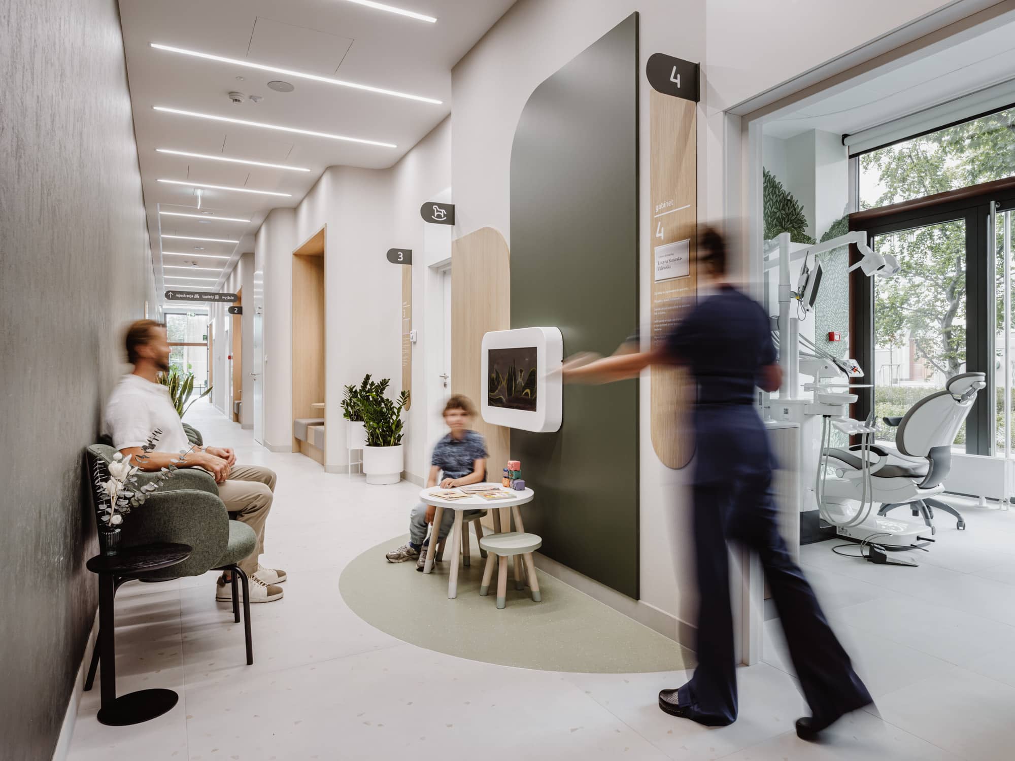 Nowa klinika to siedem gabinetów stomatologicznych, przestrzenie wspierające redukcję stresu, strefy regeneracji i kąciki dla dzieci. Jej wnętrza inspirowane są naturą - dominują tu duże przeszklenia, zieleń jako kolor przewodni, obłe kształty mebli oraz naturalne materiały, takie jak kamień i drewno. Ważnym elementem tożsamości miejsca jest lokalne DNA - corten i modernistyczna stylistyka Gdyni, a także sufit inspirowany falami morskimi. Dbałość o detal widoczna jest w architektonicznych kompozycjach luster i kinkietów, a także w wygodnych wnękach z siedziskami, które czynią przestrzeń przyjazną i komfortową.