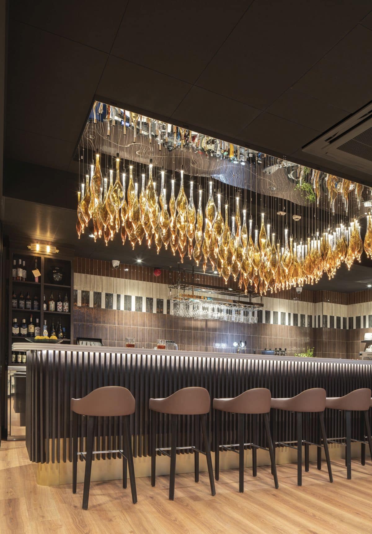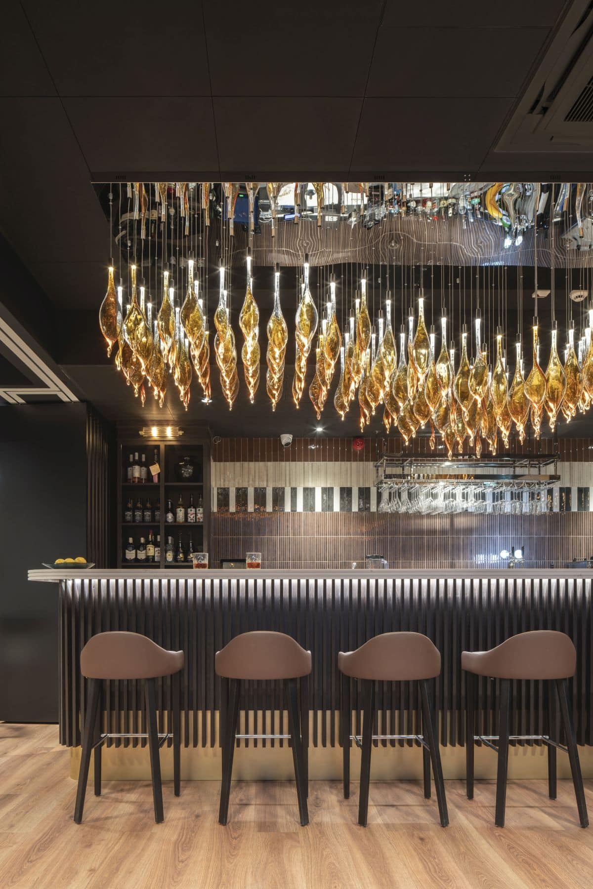 Centralnym punktem "wieczorowej' strefy jest wyspa barowa, ponad którą unosi się żyrandol wykonany na specjalne zamówienie według koncepcji architektów. W projekcie tej części dla autorów inspiracją była słynna Lazurową Grotą i widowiskowe refleksy światła opromieniające sople stalaktytów. Tafla zawieszonego nad kontuarem lustra staje się sceną dla efektownej gry światła, wzmacniając przyciągający wzrok, teatralny efekt przestrzenny. Utrzymane w ciemnej tonacji kolorystycznej wnętrze tworzy elegancki nastrój, w sam raz na lampkę czerwonego wina czy łyk espresso martini.