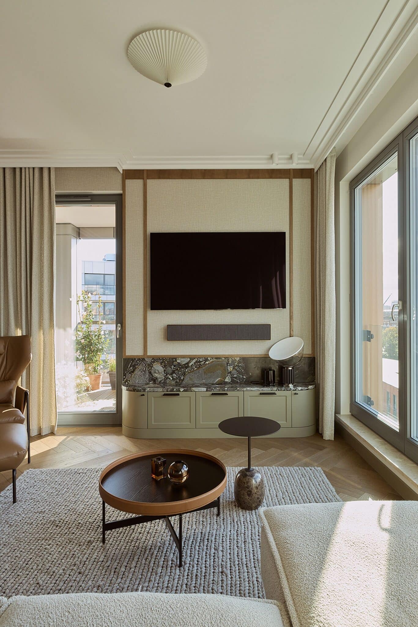 Już od pierwszego kroku przyszłych mieszkańców i gości wita subtelna gra światła odbijanego w lustrzanych powierzchniach. W holu znalazła się smukła skórzana ławka Fifties Calligaris, inspirowana latami 50. W części prywatnej apartamentu zastosowano egzotyczne tapety Ananbo, które nadają wnętrzu nieco kolonialnego charakteru. Miękkie tkaniny, ciężkie zasłony i stonowane barwy tworzą tu idealne warunki do wypoczynku. Połączona z sypialnią łazienka, wykończona wielkoformatowymi płytami inspirowanymi trawertynem, wzmacnia wrażenie luksusu. W apartamencie znajdziemy również kompaktowy gabinet, idealny dla osób pracujących zdalnie. Korytarz zaprojektowano tak, by zyskać dodatkową zabudowę, w której sprytnie ukryto pralnię, co uwalnia przestrzeń w łazienkach i zwiększa komfort korzystania z mieszkania.