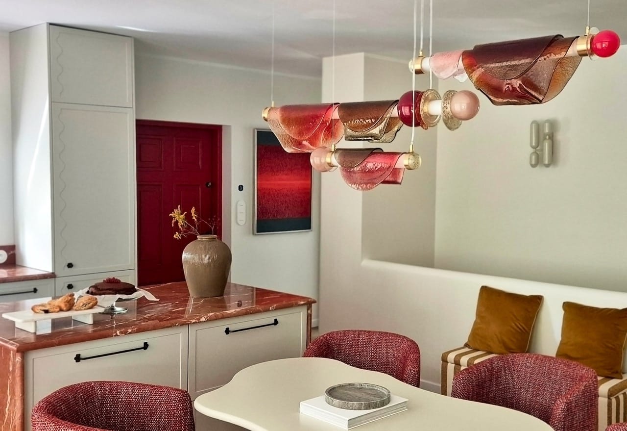 Dopełnieniem całości stały się obrazy przywiezione przez Olę z galerii oraz czerwone drzwi, które wymarzyła sobie Sonia. Wszystko zagrało idealnie. Ale bez wątpienia to właśnie lampa stała się głównym elementem wnętrza. Przyciąga uwagę i nadaje całości charakter. Ściana, na tle której została zawieszona, tworzy dla niej doskonałą scenerię. We wnętrzu dominują ciepłe barwy - kamienie, drewno, tkaniny - i właśnie to kontrastujące chłodne światło sprawiło, że kolory lampy nabrały jeszcze większej głębi. Każdy odcień ze środka odnalazł swoje odbicie w tej instalacji. Jakby cała przestrzeń została zamknięta i przefiltrowana w szkle.