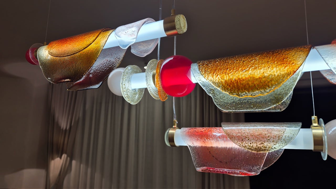 Instalacja okazała się dość spora. Tak naprawdę powstało z niej coś więcej niż tylko lampa. To już pełnoprawna instalacja artystyczna, działająca zarówno w świetle sztucznym, jak i dziennym. W ciągu dnia kolory grają inaczej, a naturalne światło wydobywa subtelne niuanse. Co ważne, nawet zgaszona lampa robi ogromne wrażenie - jak samodzielna rzeźba we wnętrzu.