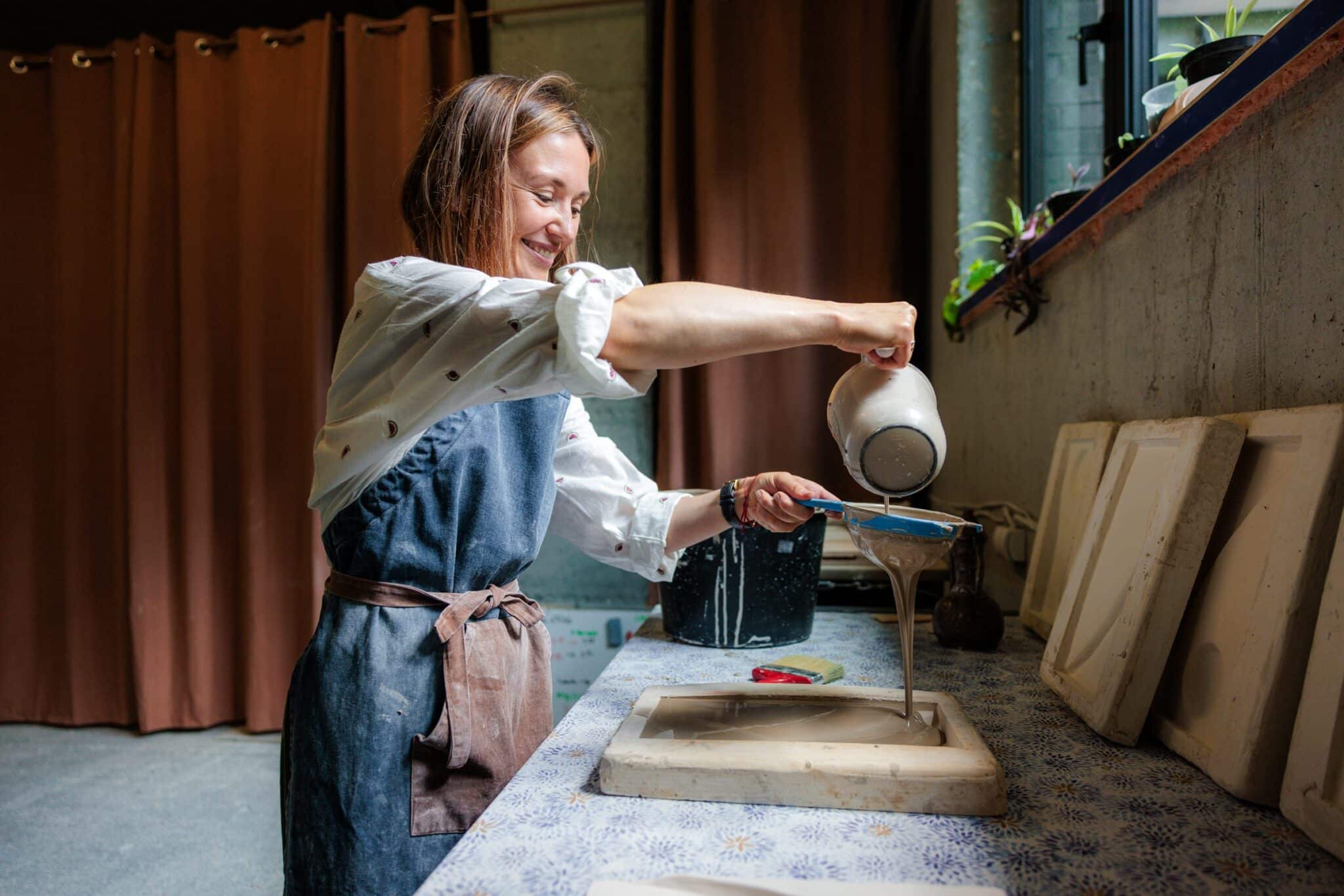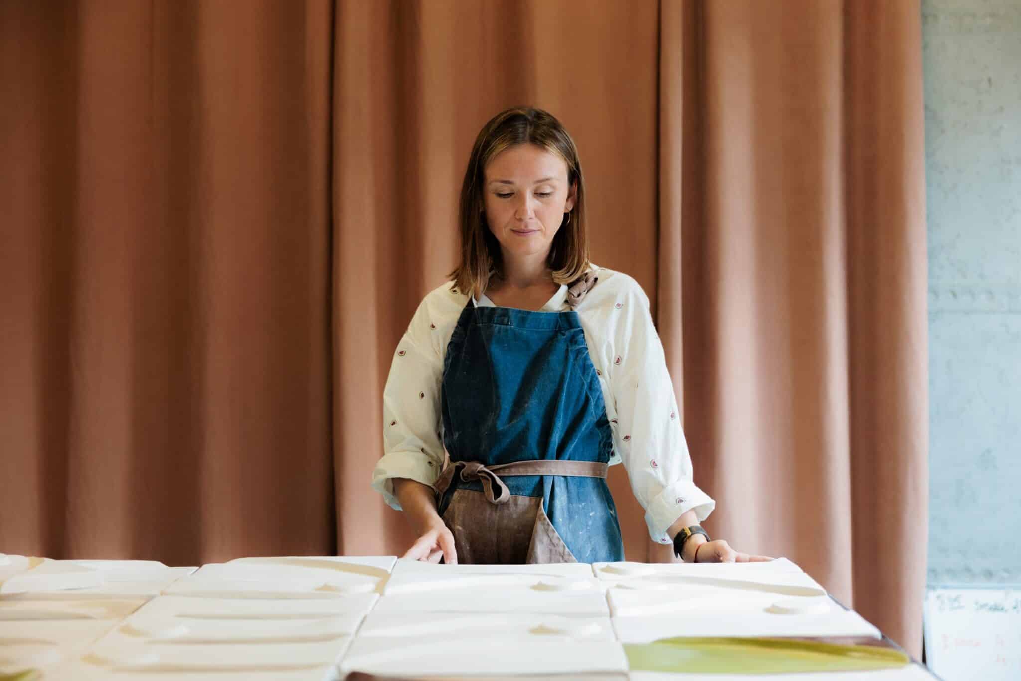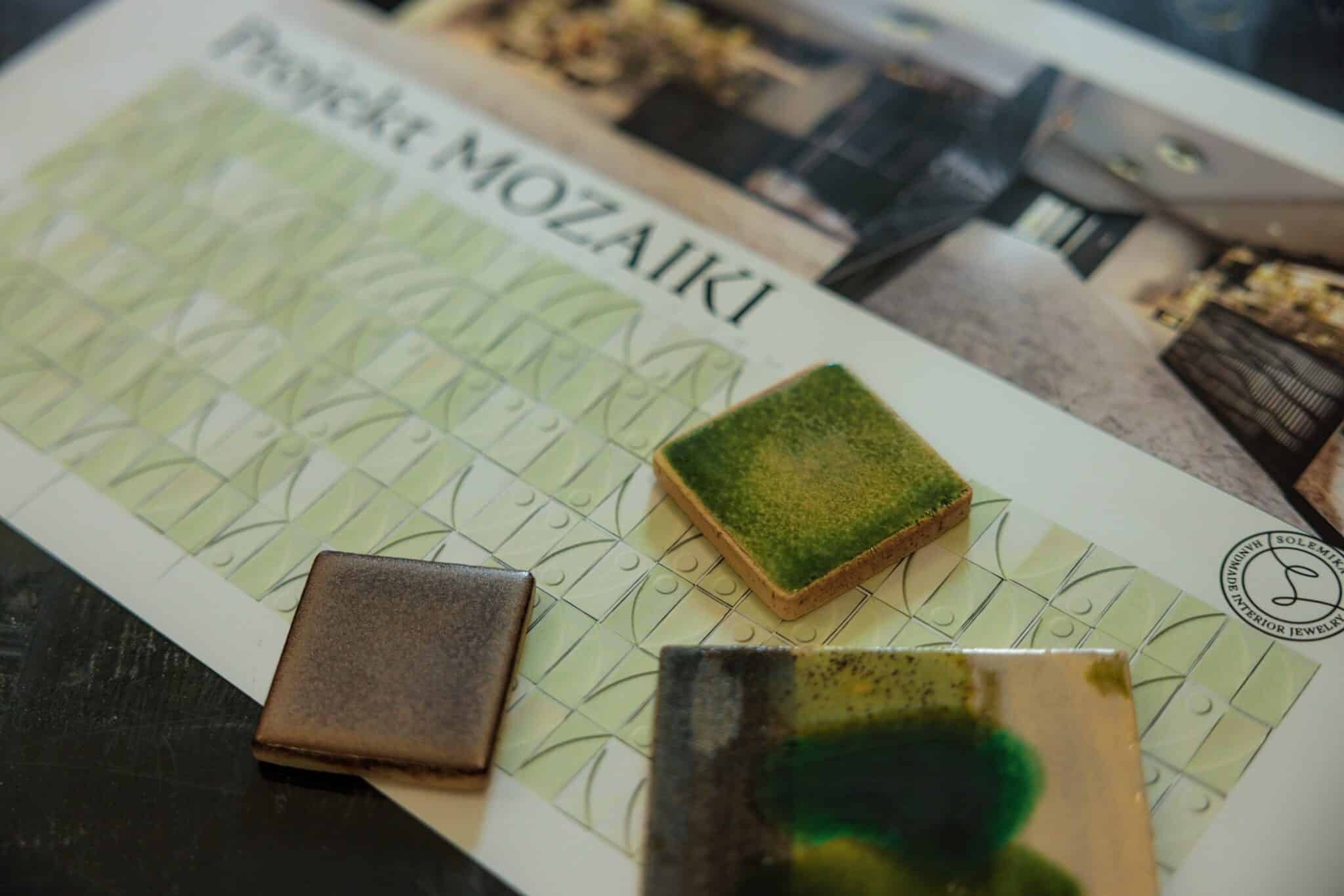 Abstrakcyjny wzór mozaiki w odcieniach zieleni, brązu i beżu powstaje w krakowskiej pracowni Dominiki Jastrzębskiej - artystki, która swój warsztat doskonaliła w Portugalii, kraju słynącym z mistrzowskiej tradycji ceramicznej. To właśnie tam zetknęła się z unikalnym podejściem do materiału, w którym każdy niewielki fragment ma znaczenie dla całości. Jej realizacje wyróżniają się ekspresją, w których kolor, faktura i rytm stają się opowieścią samą w sobie.