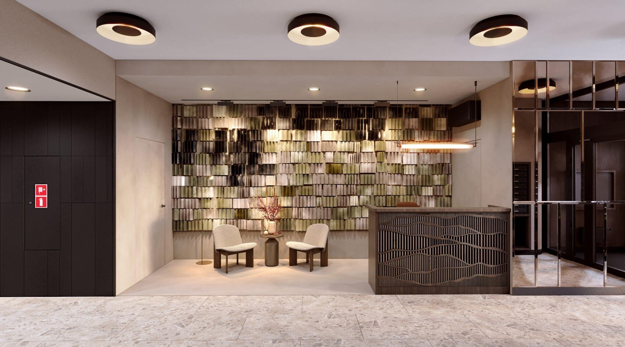 Szczególnym akcentem architektonicznym będzie ścienna mozaika zdobiąca lobby oraz elewację przy wejściu do budynku mieszkalnego. To rozwiązanie, które podkreśla unikalność inwestycji i odwołuje się do najlepszych tradycji wzornictwa, stanowiąc zarazem element artystyczny w przestrzeni codziennego użytku. Dzięki niej wnętrze zyska indywidualny charakter, a mieszkańcy będą mogli na co dzień obcować ze sztuką, która nie tylko zdobi, lecz także buduje wyjątkową atmosferę miejsca.